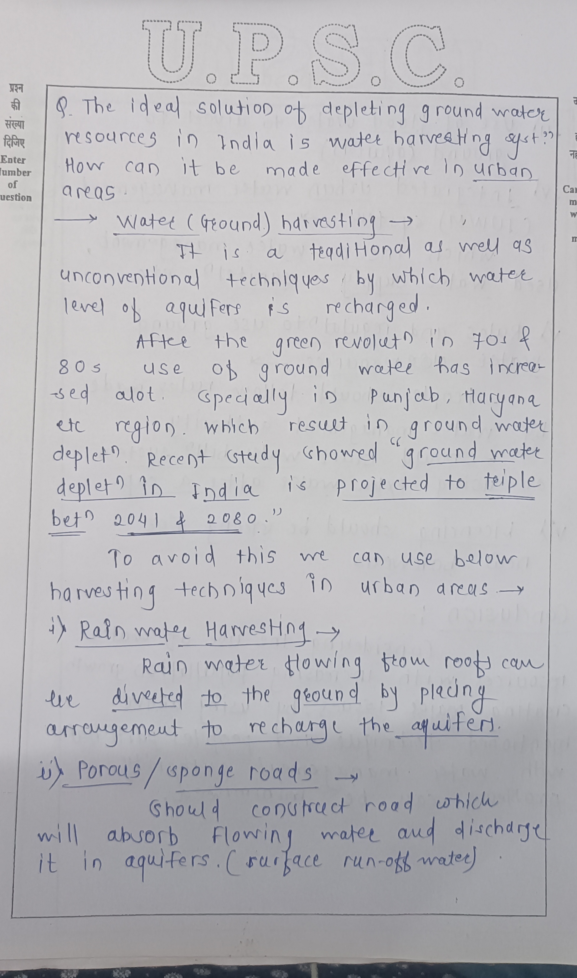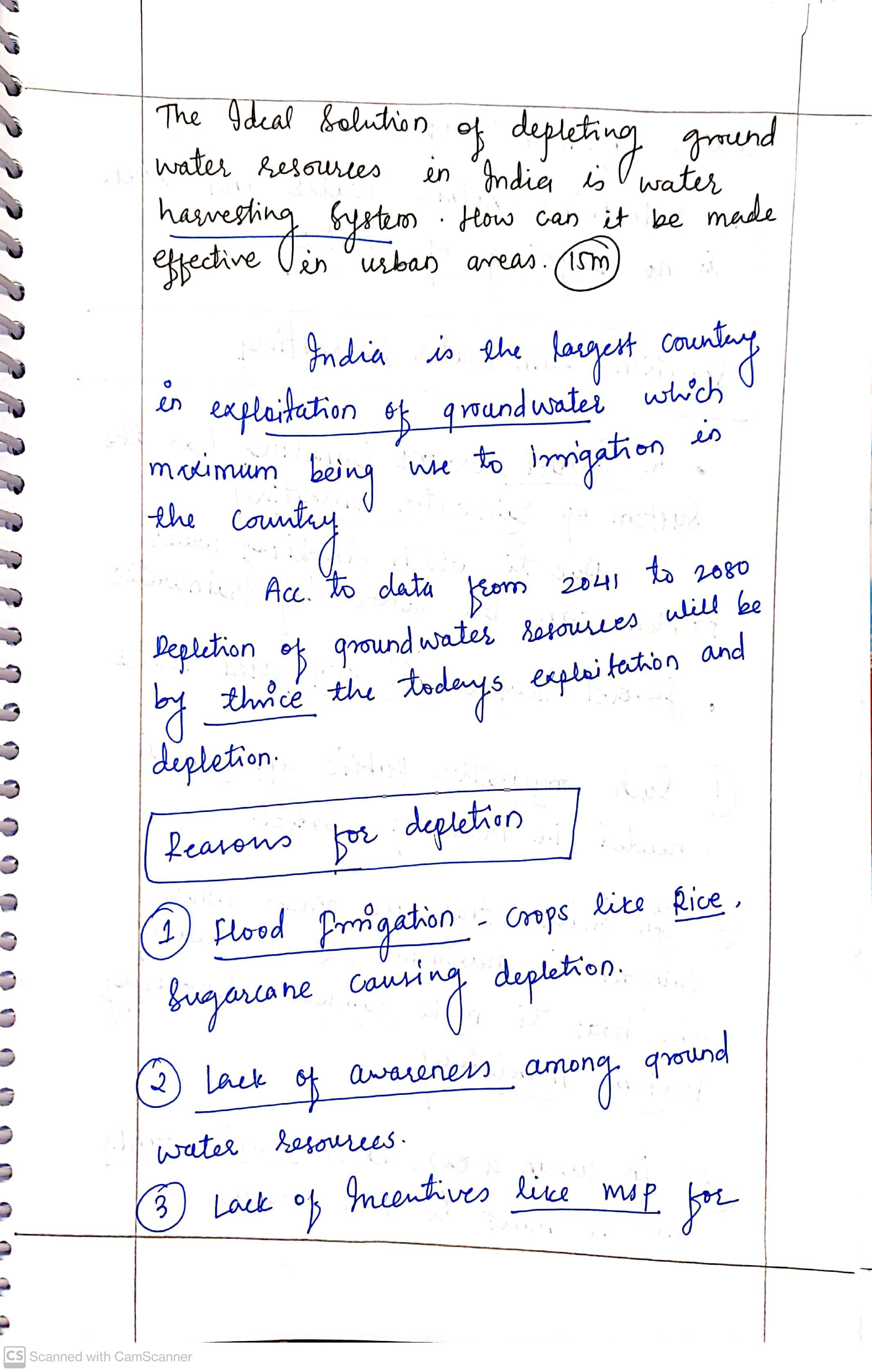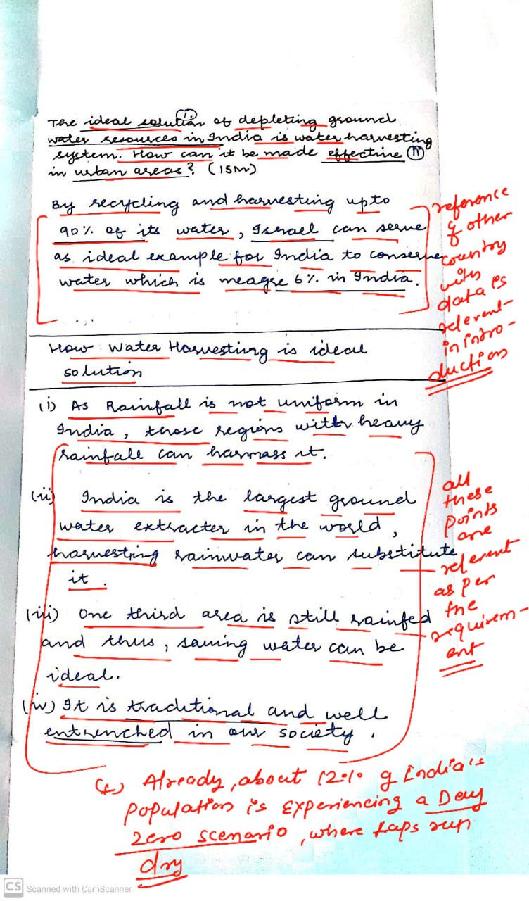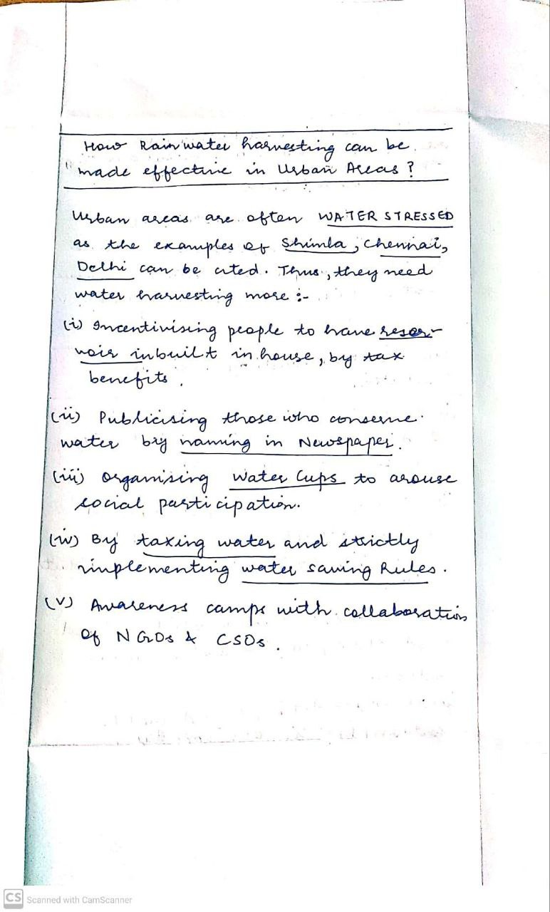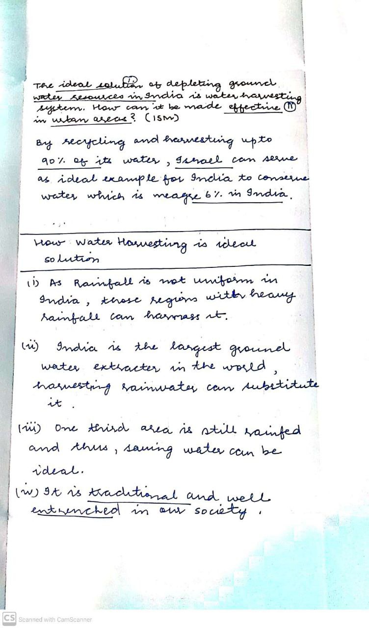 Q. The ideal solution of depleting ground water resources in India is water harvesting system. How can it be made effective in urban areas? (250 words, 15 Marks)