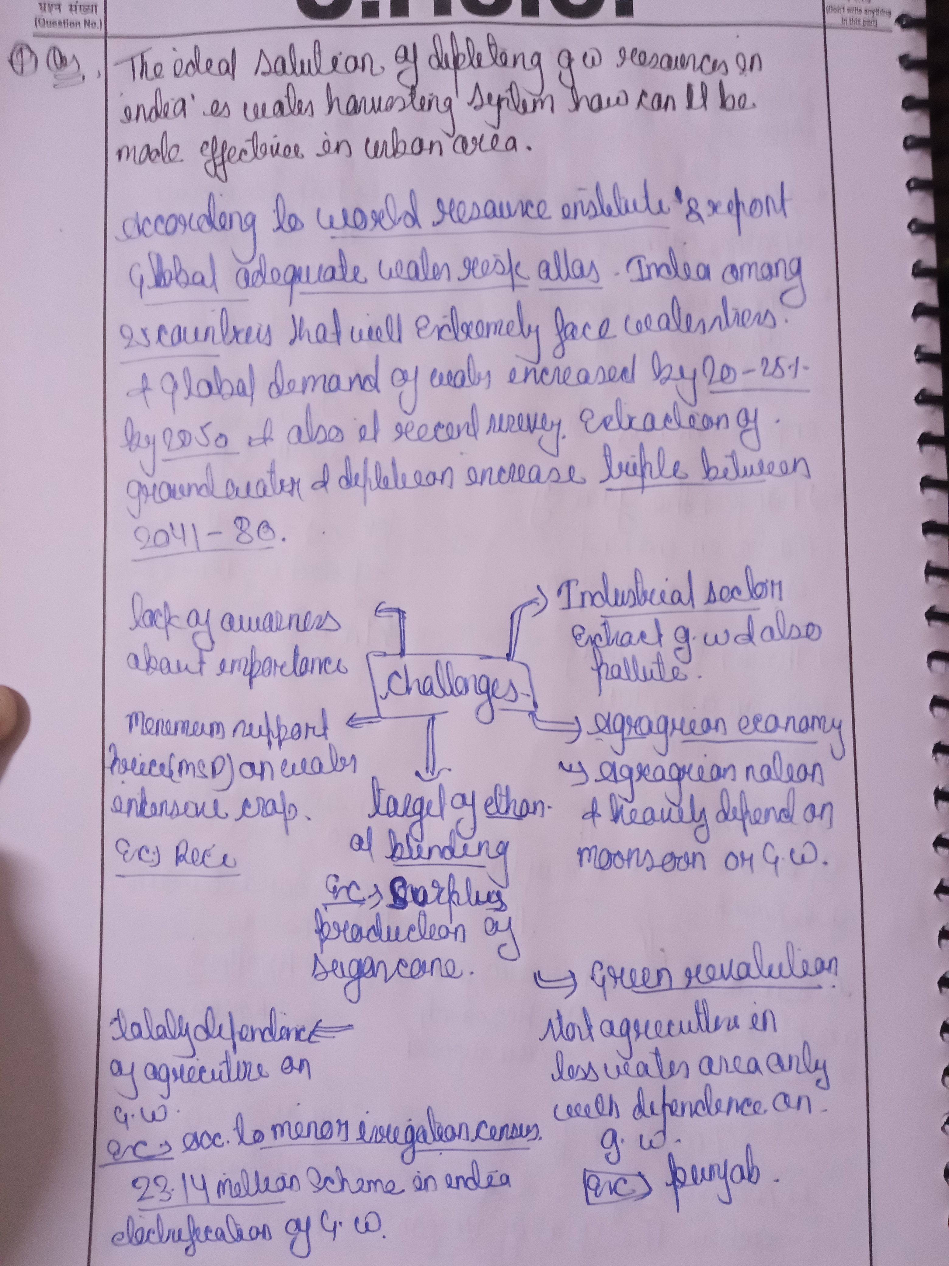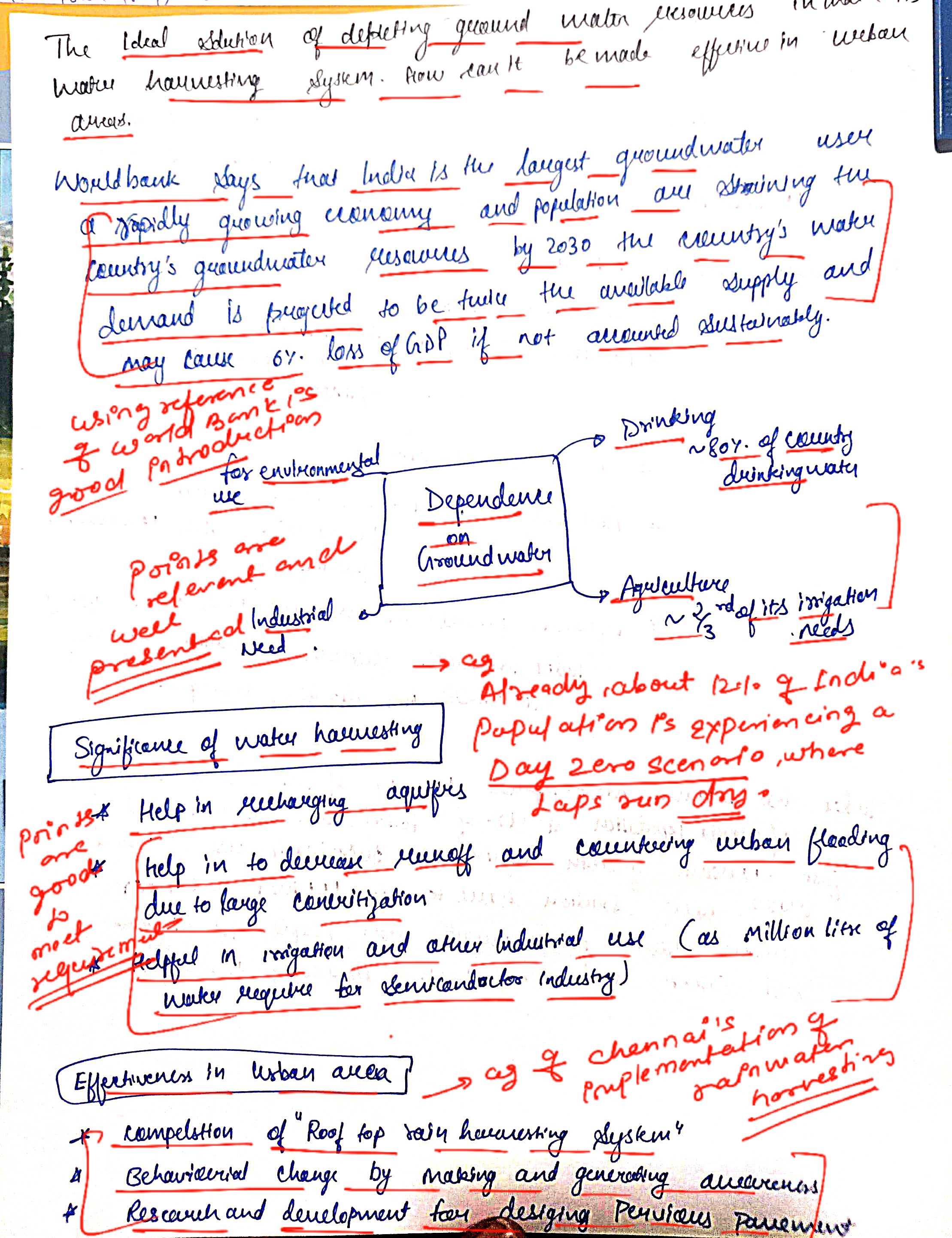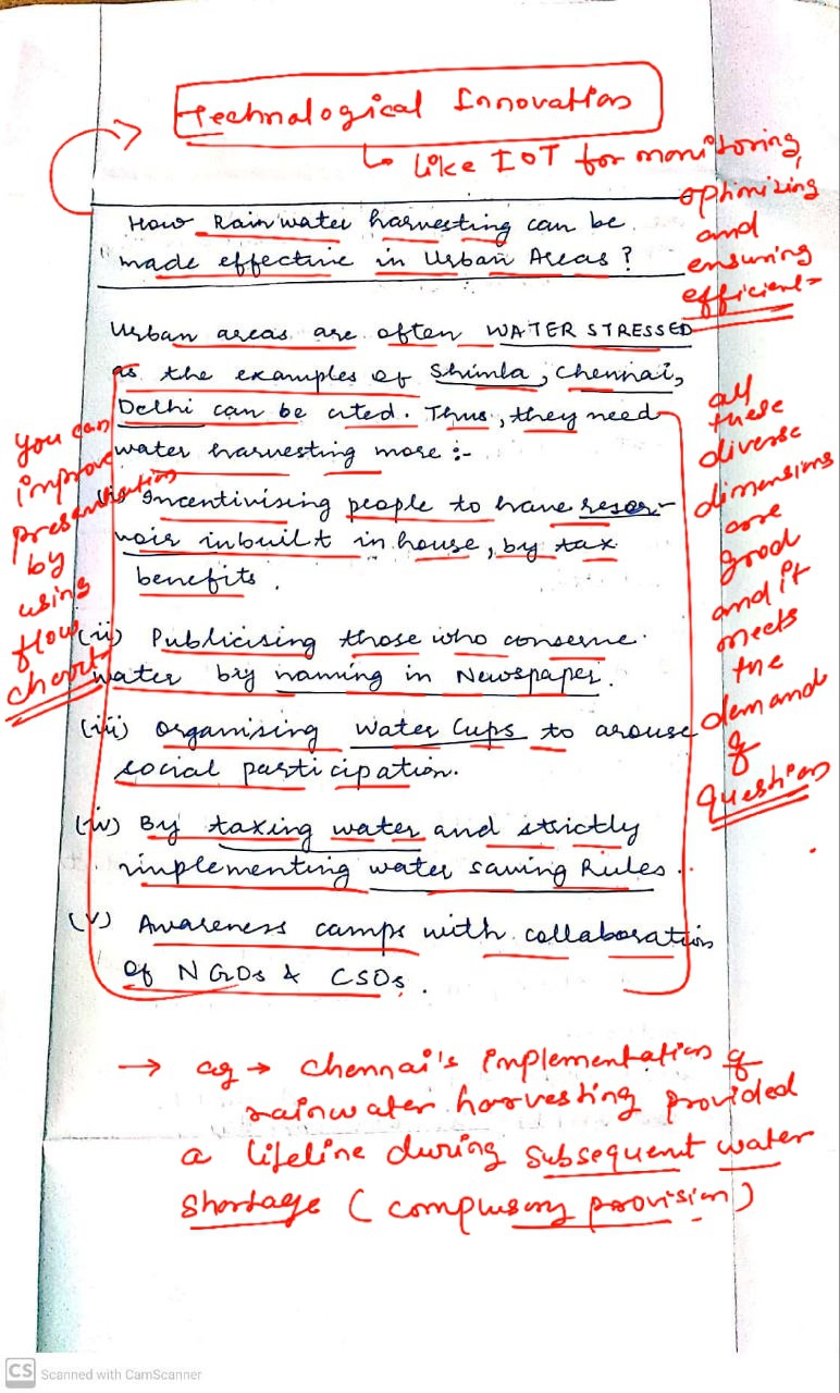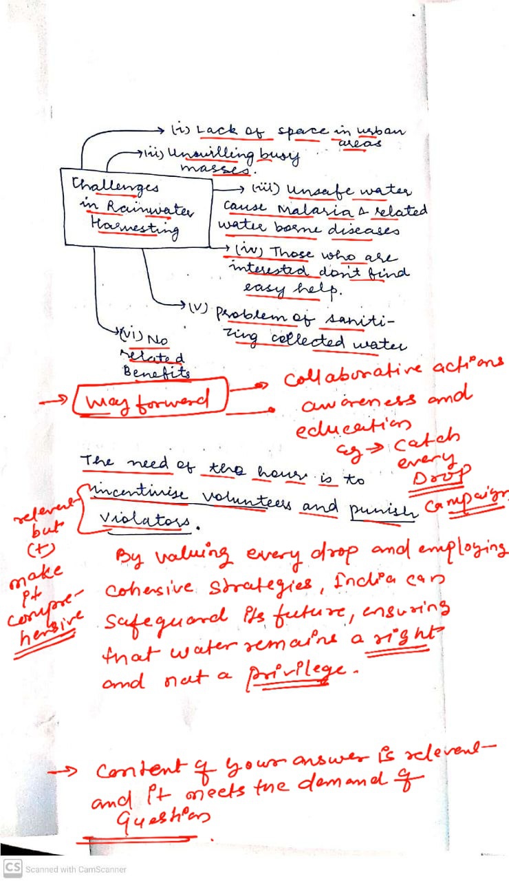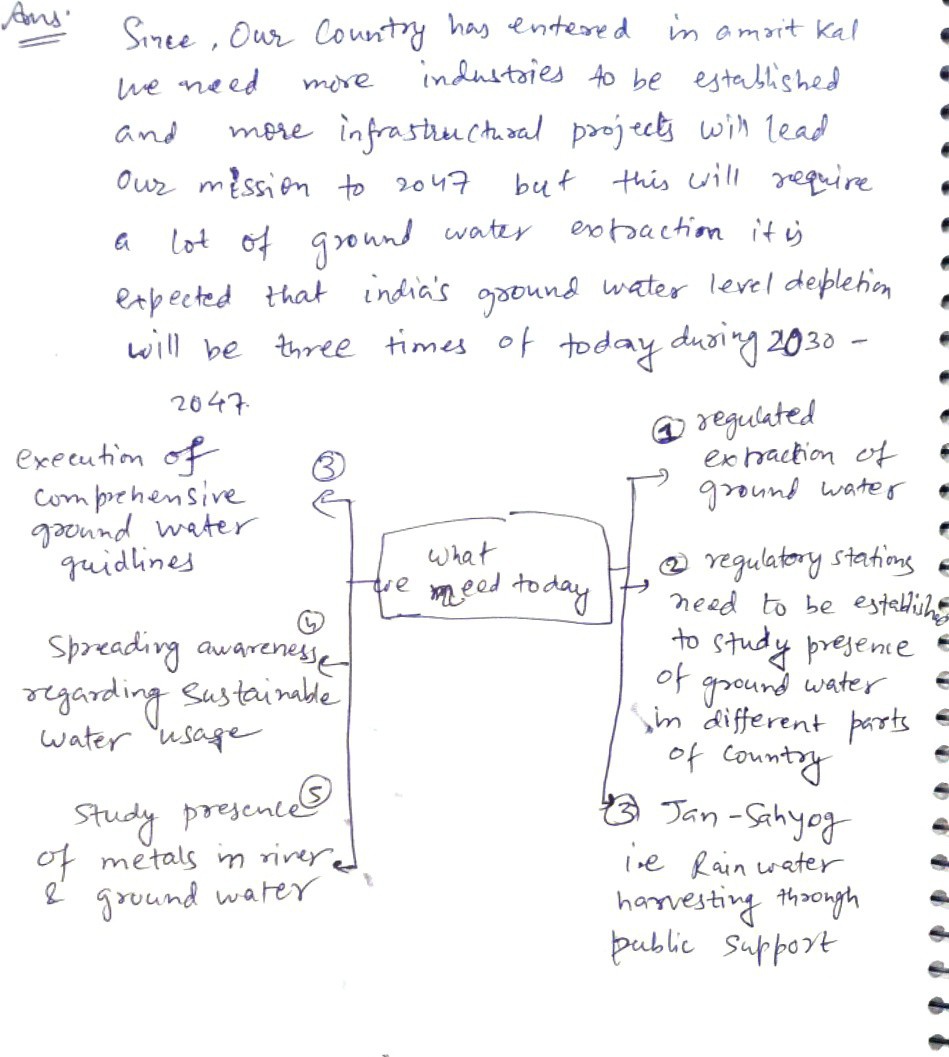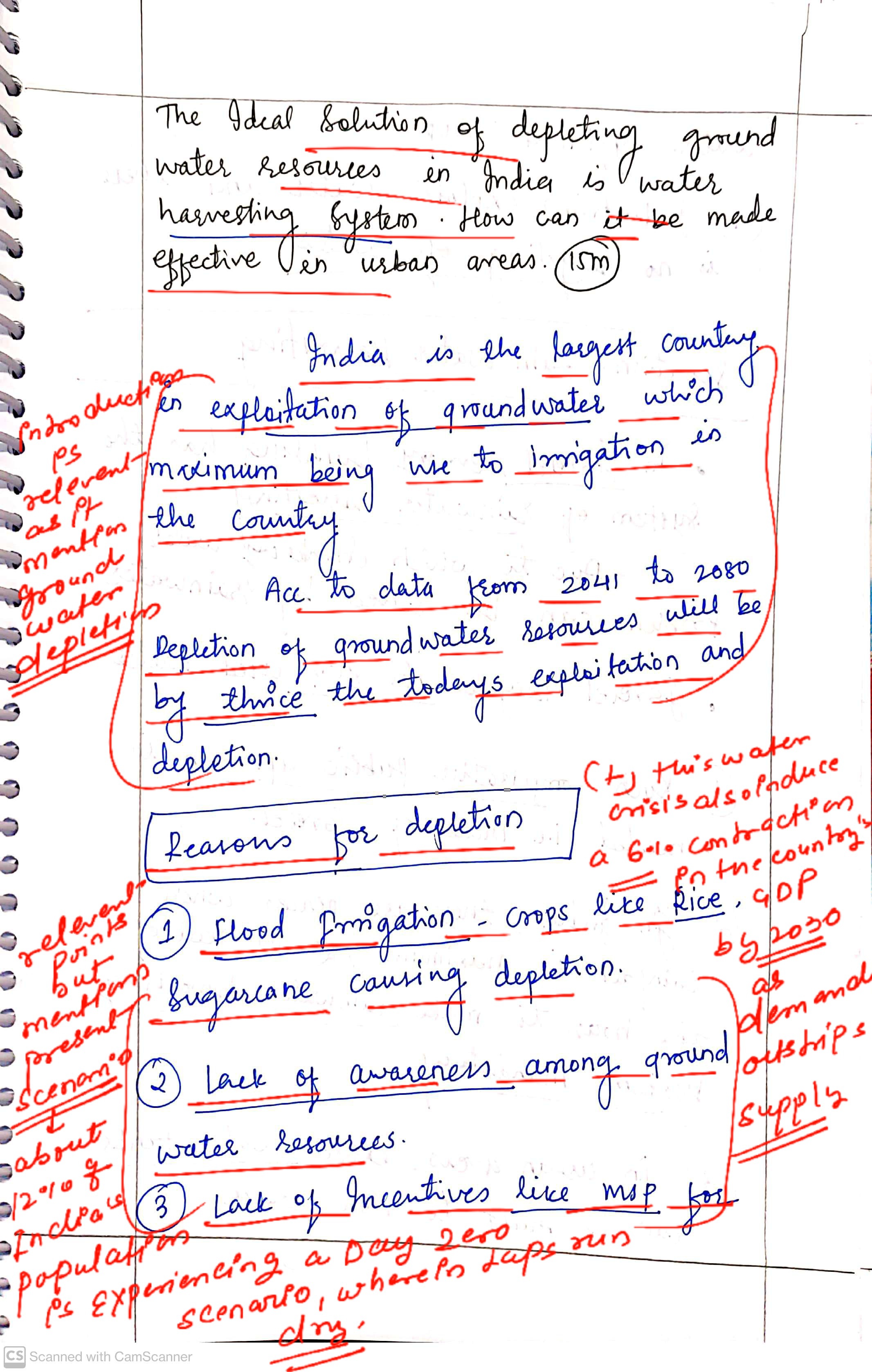 Q. The ideal solution of depleting ground water resources in India is water harvesting system. How can it be made effective in urban areas? (250 words, 15 Marks)
