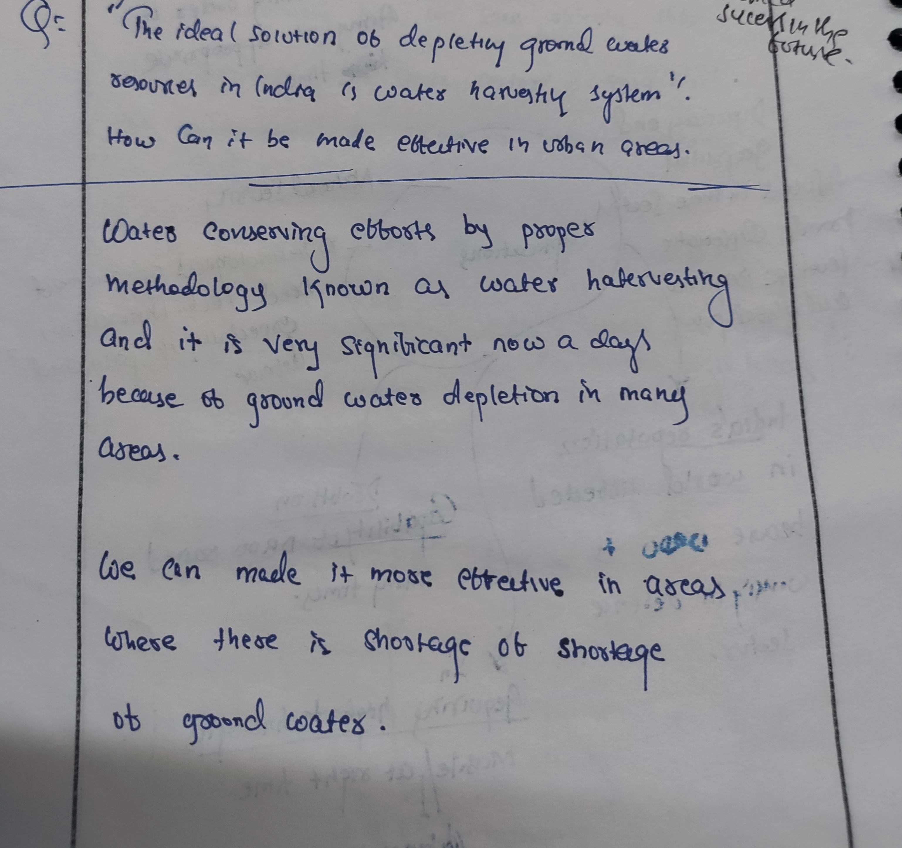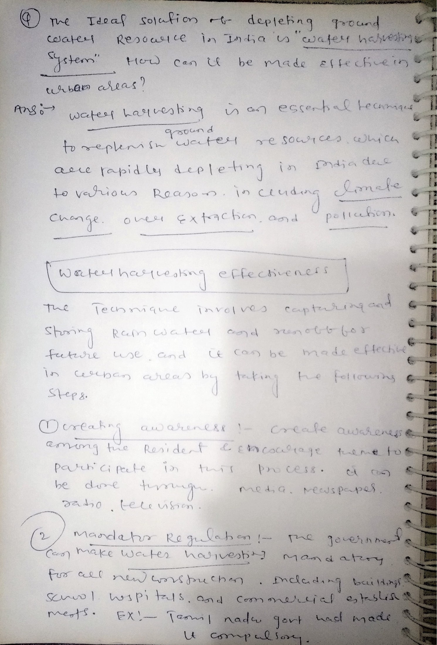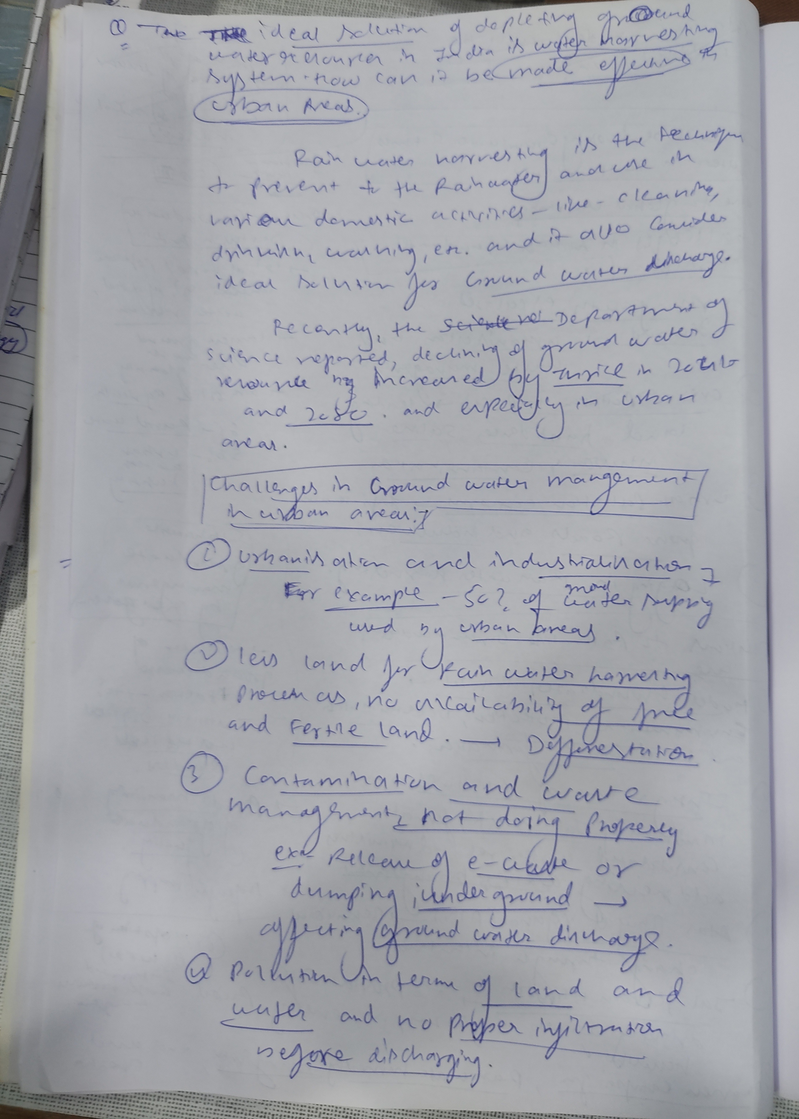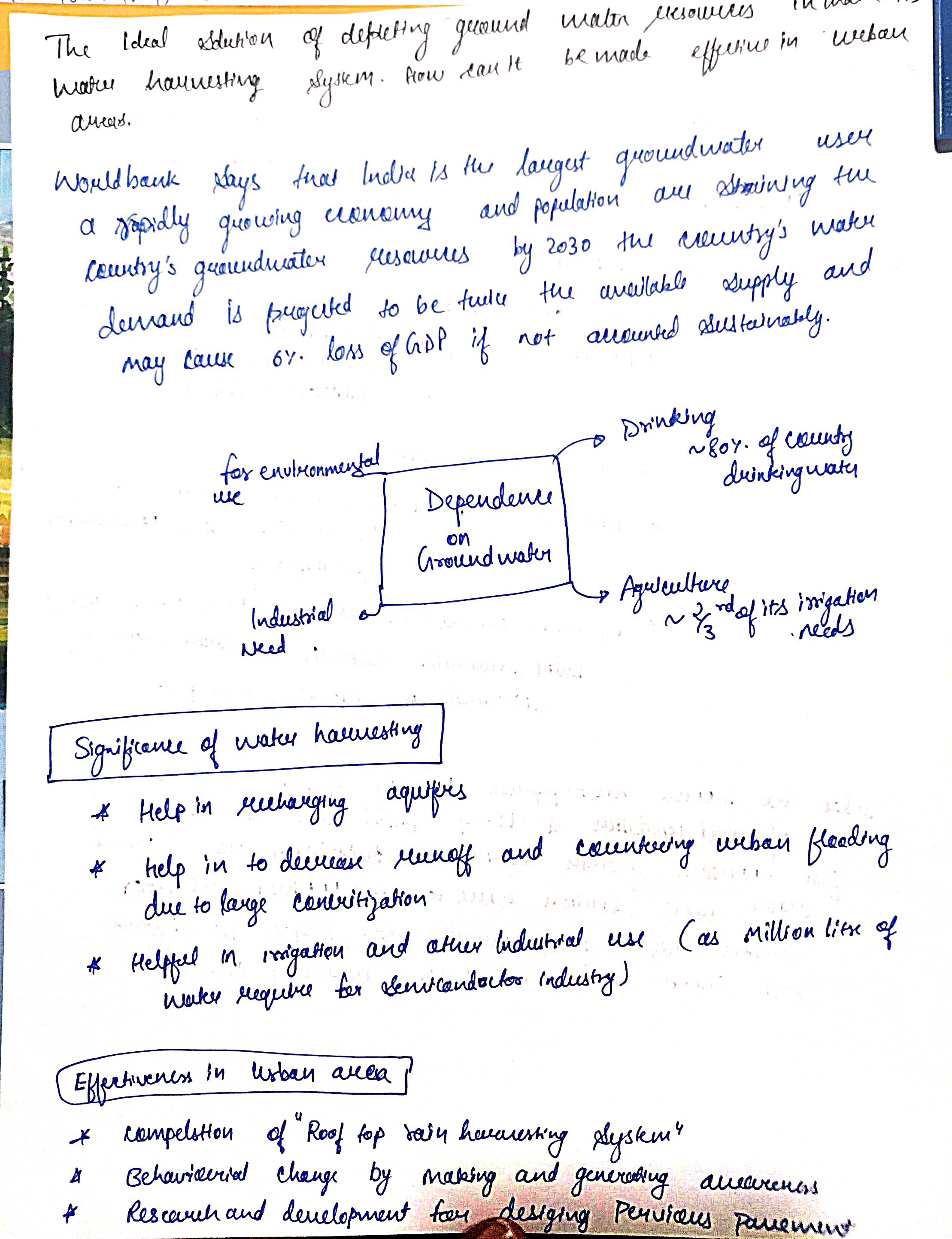 Q. The ideal solution of depleting ground water resources in India is water harvesting system. How can it be made effective in urban areas? (250 words, 15 Marks)