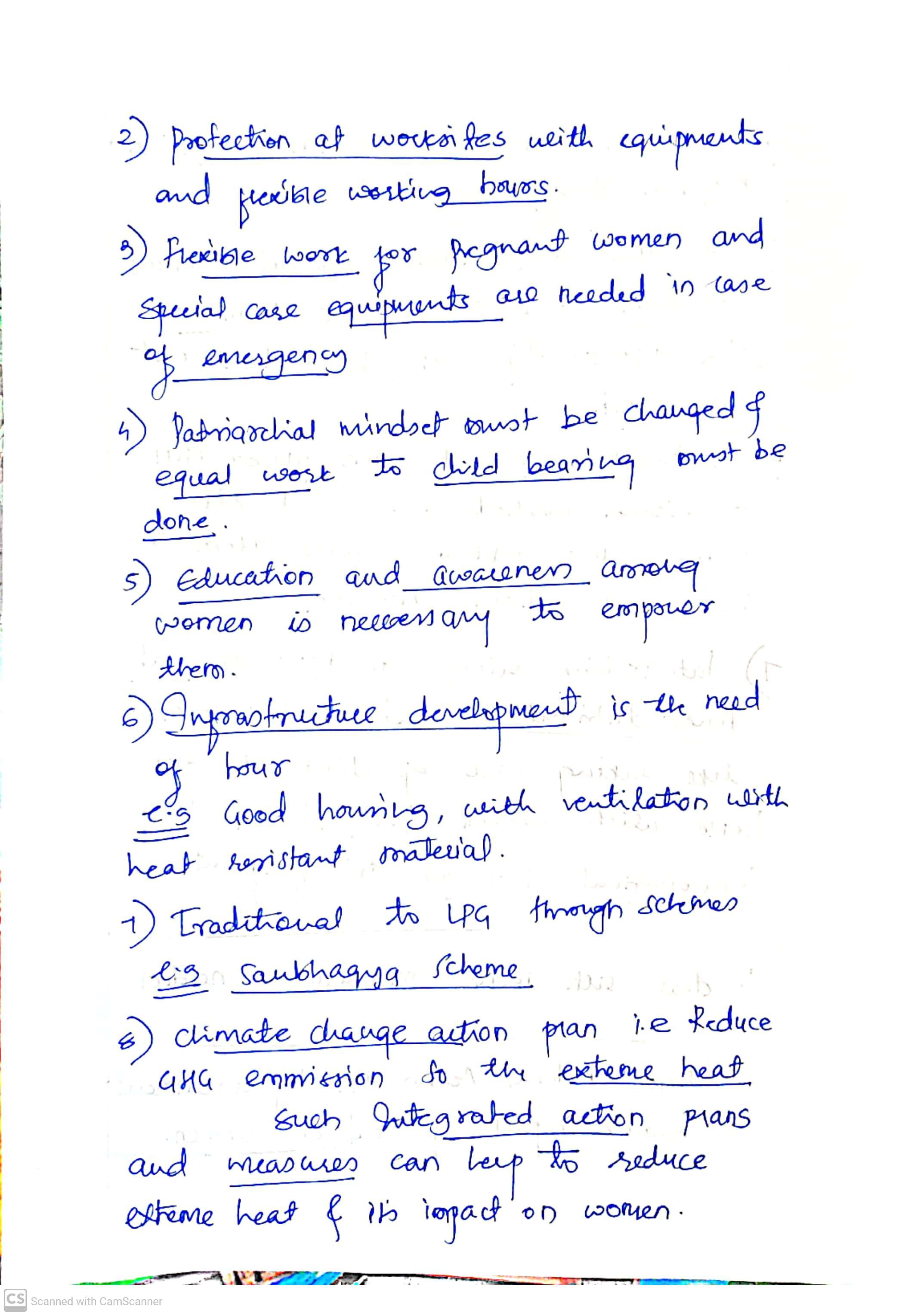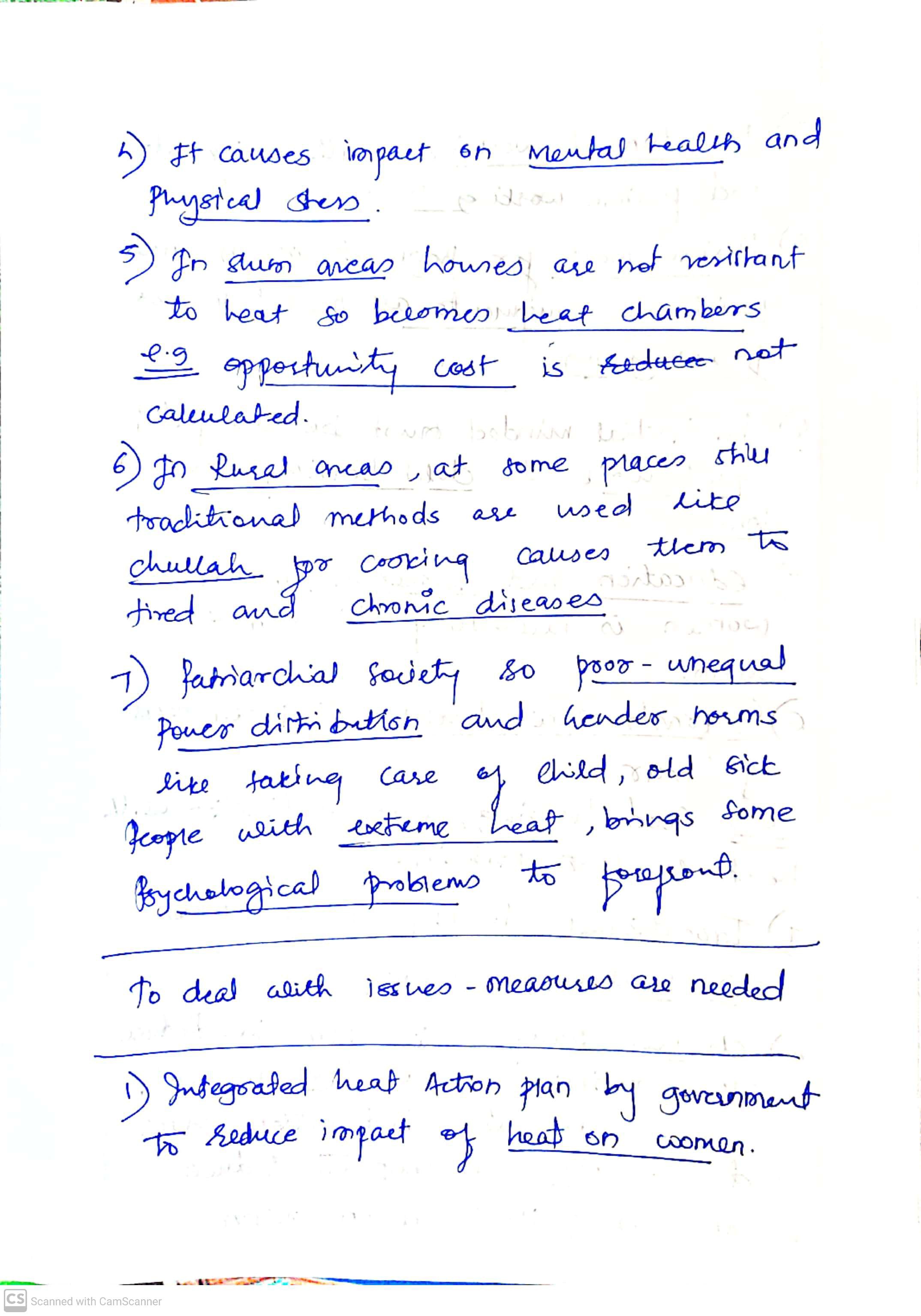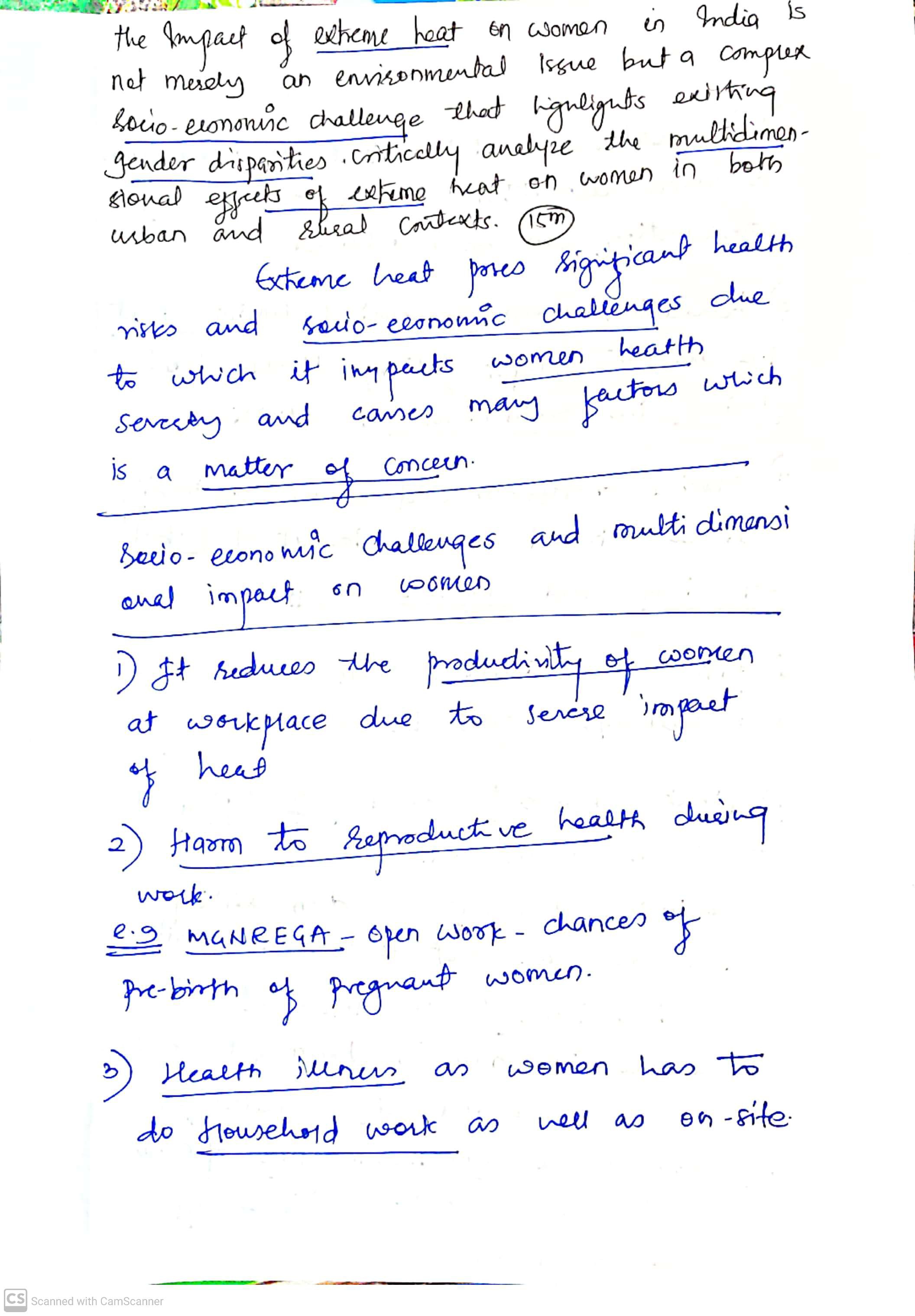 Q. The impact of extreme heat on women in India is not merely an environmental issue but a complex socio-economic challenge that highlights existing gender disparities. Critically analyze the multidimensional effects of extreme heat on women in both urban and rural contexts. (15 Marks, 250 Words)