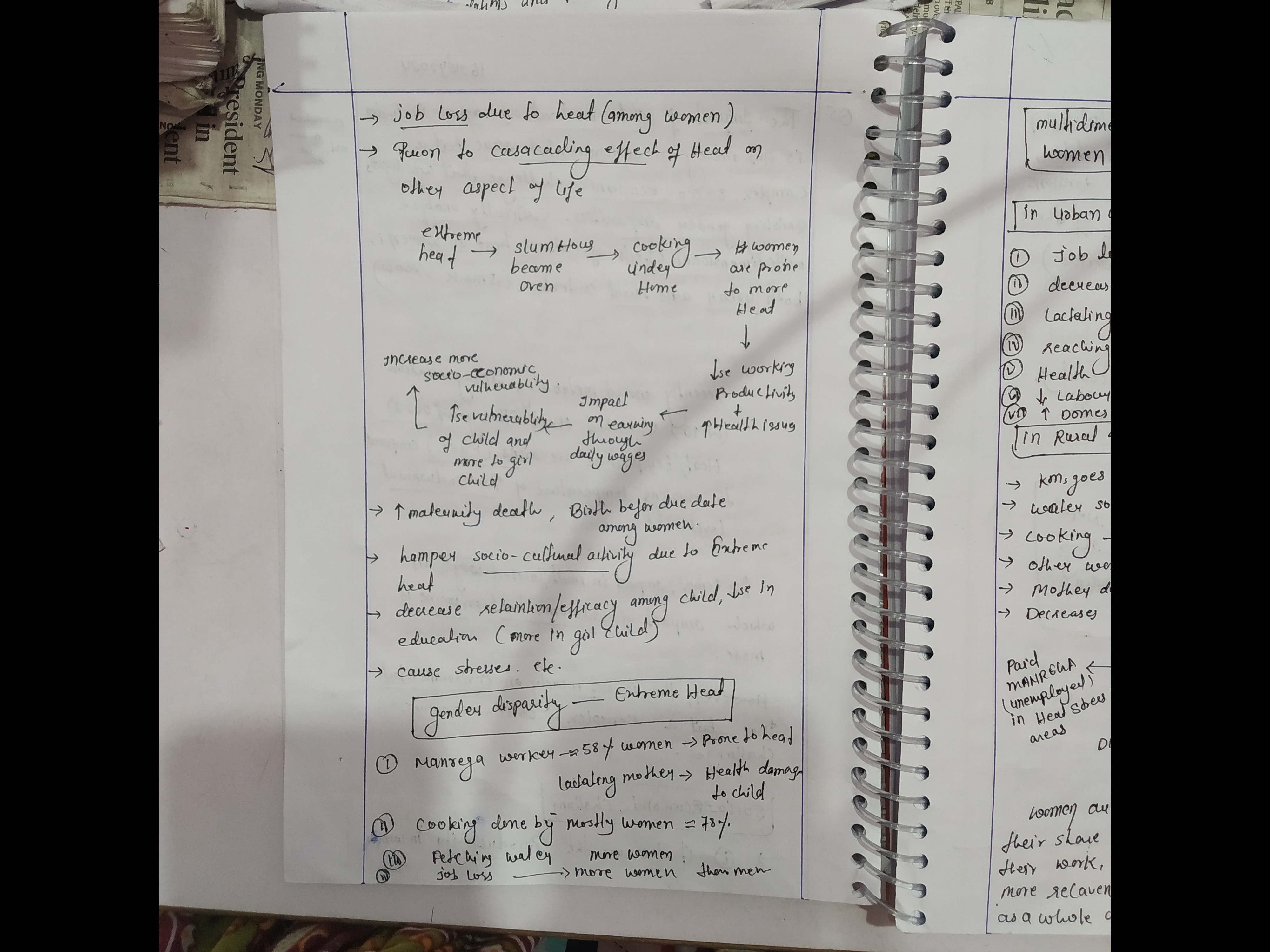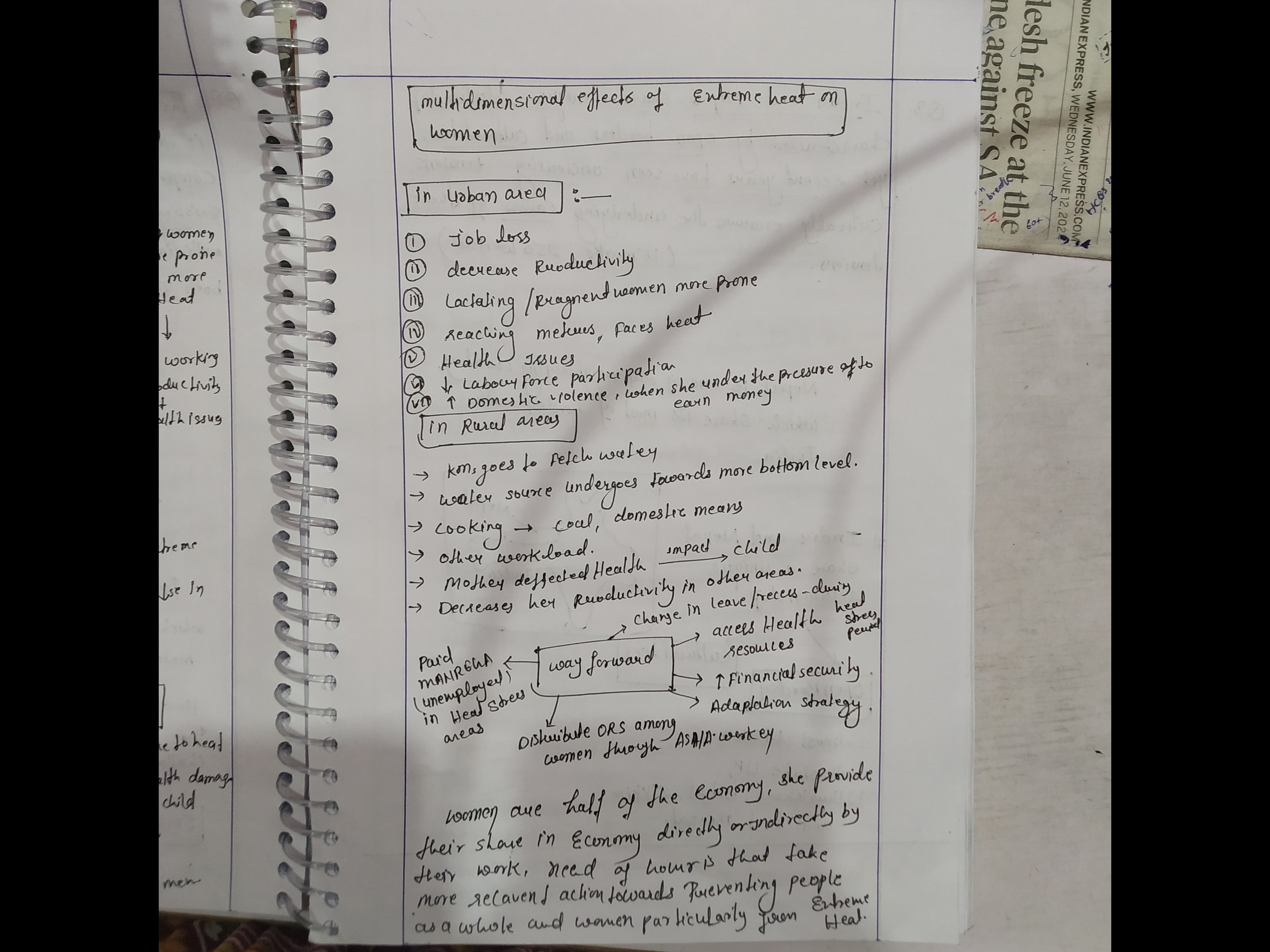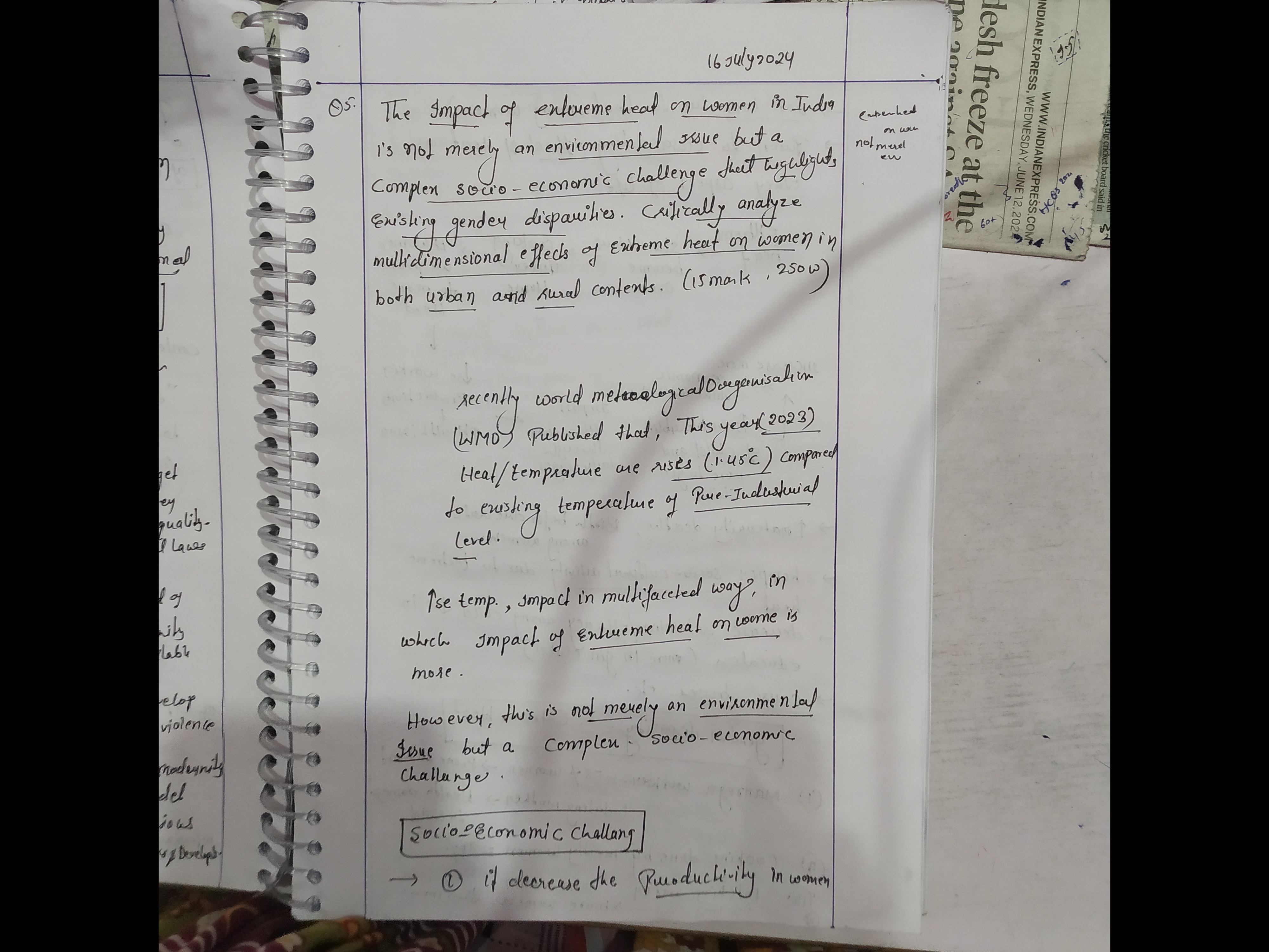 Q. The impact of extreme heat on women in India is not merely an environmental issue but a complex socio-economic challenge that highlights existing gender disparities. Critically analyze the multidimensional effects of extreme heat on women in both urban and rural contexts. (15 Marks, 250 Words)