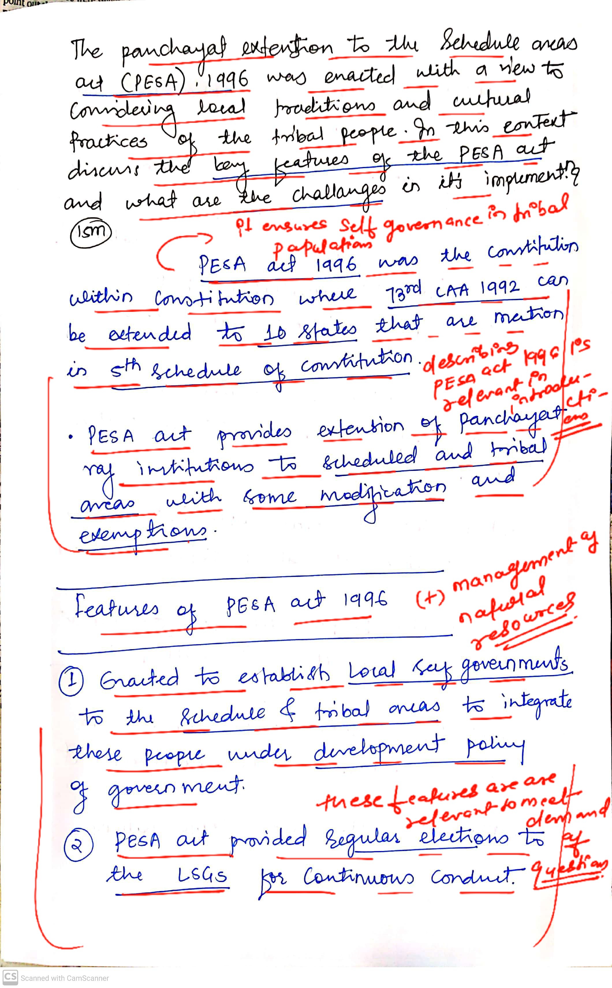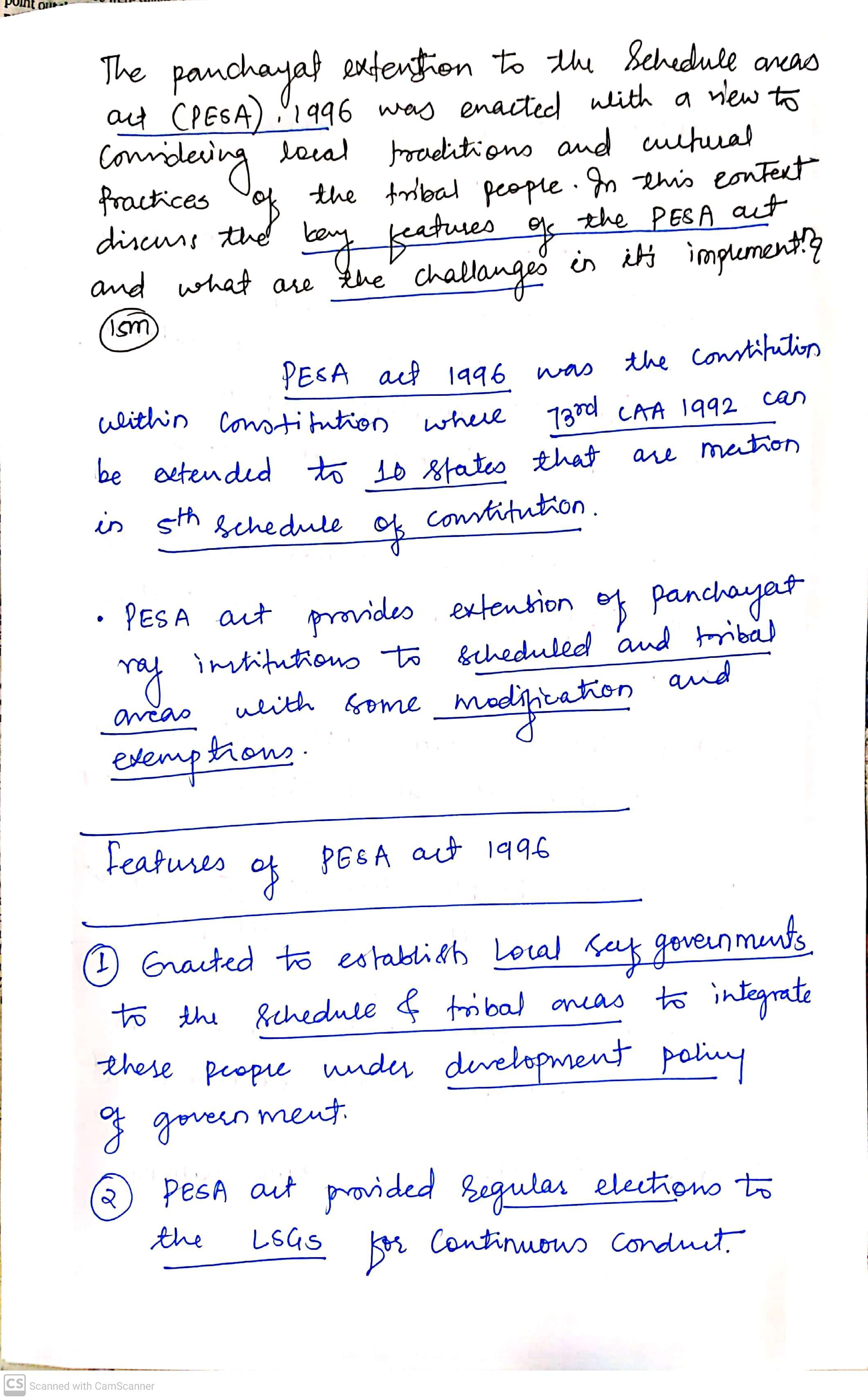 Q. The Panchayats Extension to the Scheduled Areas Act (PESA), 1996 was enacted with a view to conserving local traditions and cultural practices of the tribal people. In this context discuss the key features of the PESA Act and what are the challenges in its implementation? (250 words, 15 Marks)