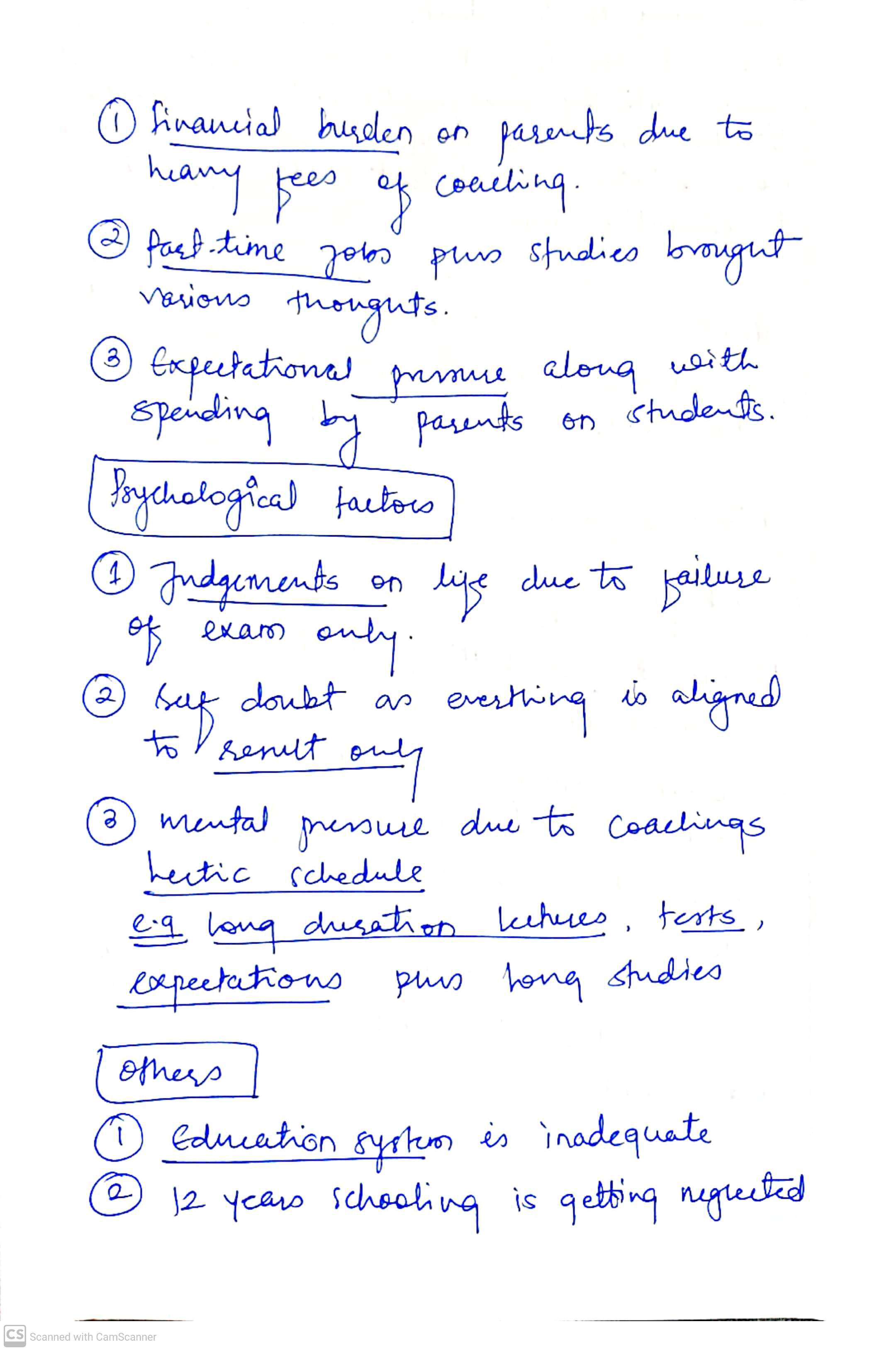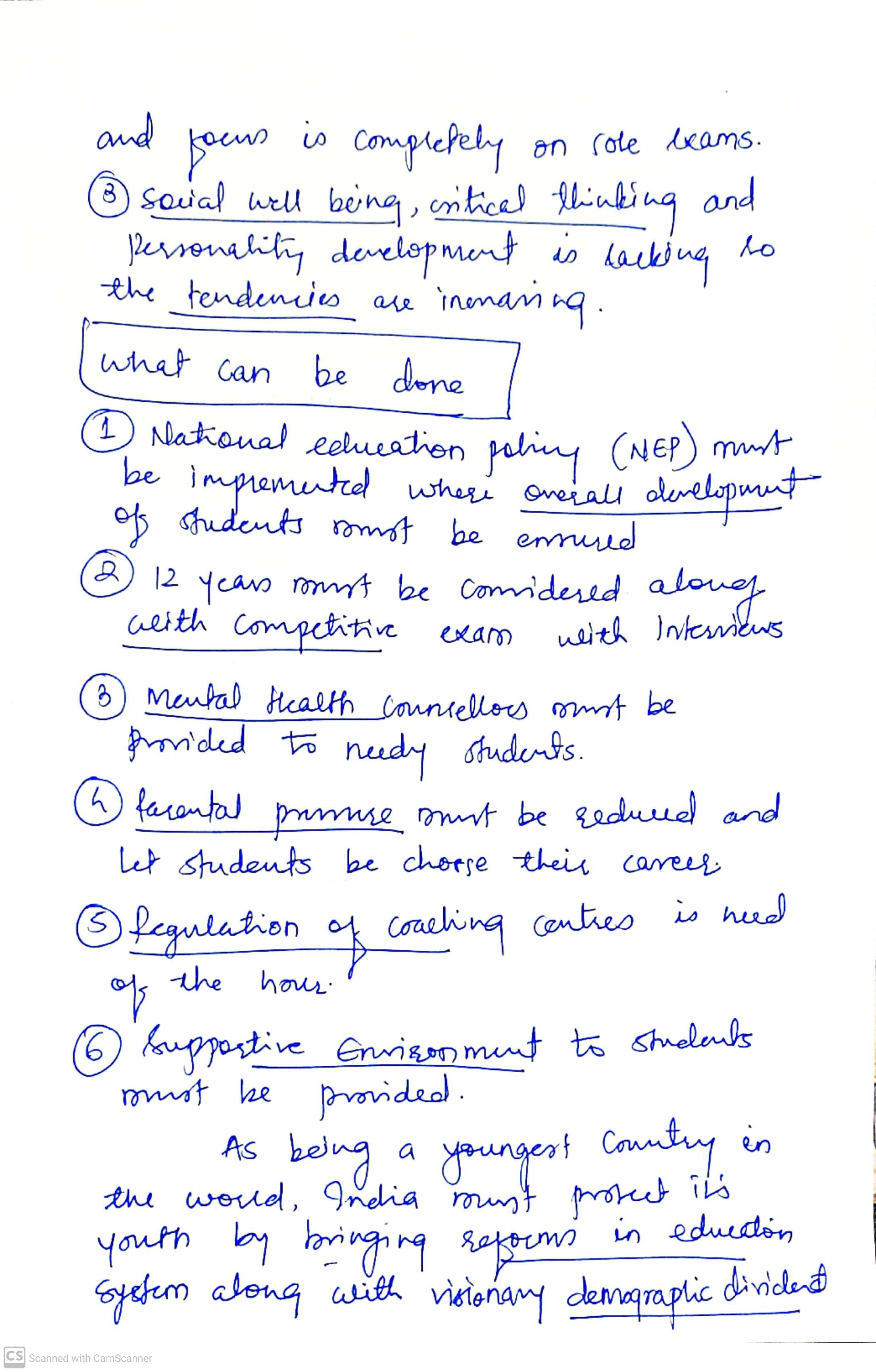 - Discuss academic pressure, commercialisation of education, inadequate mental health support, and societal pressures.