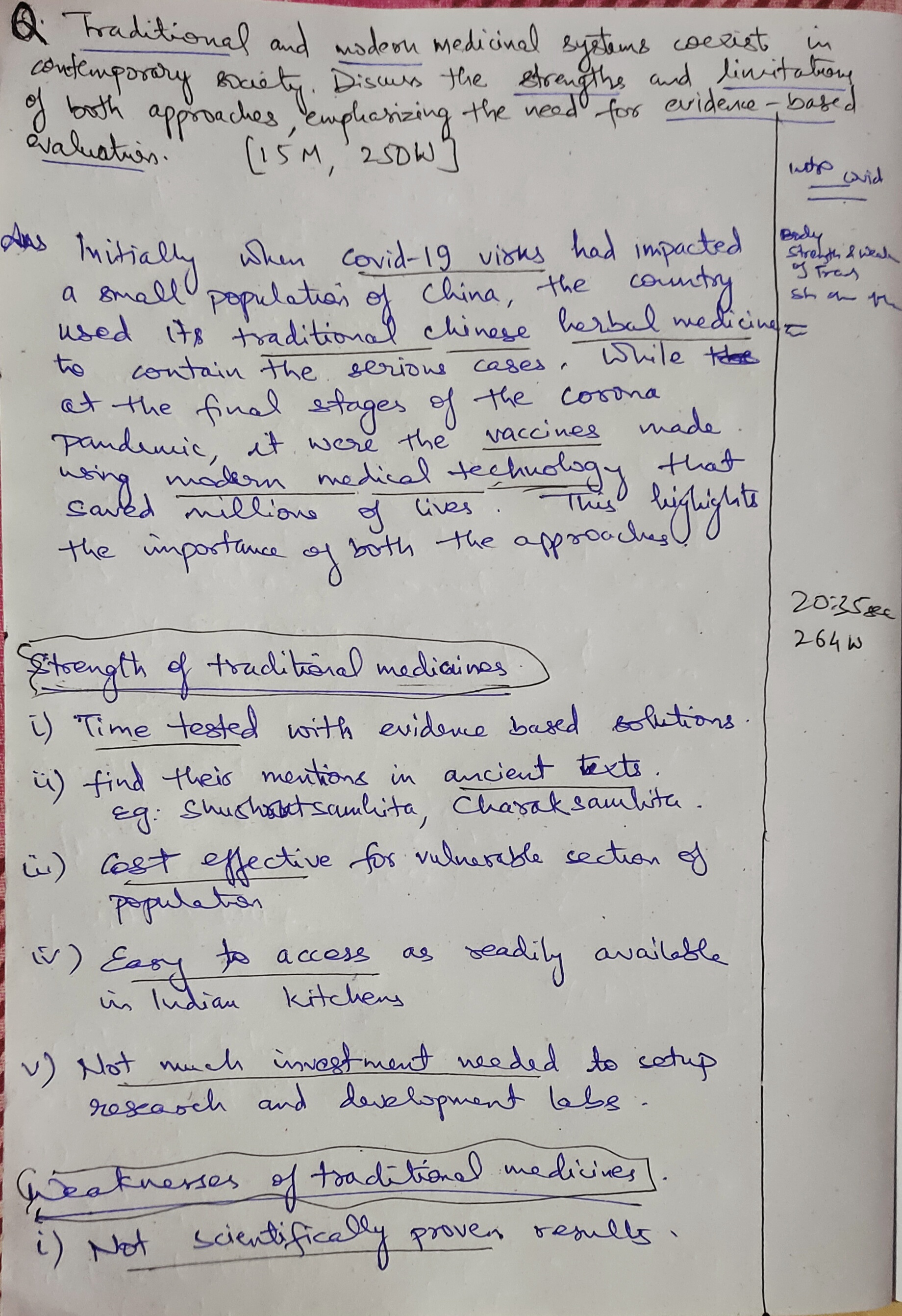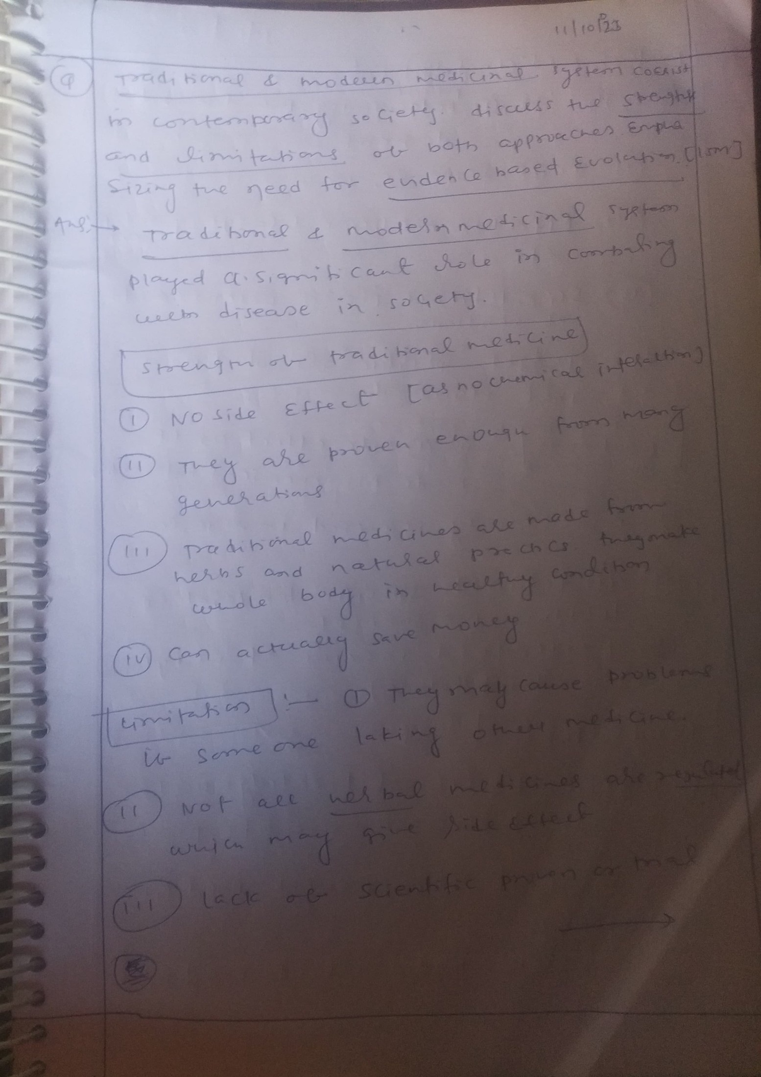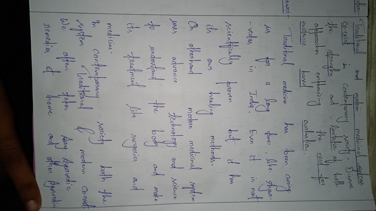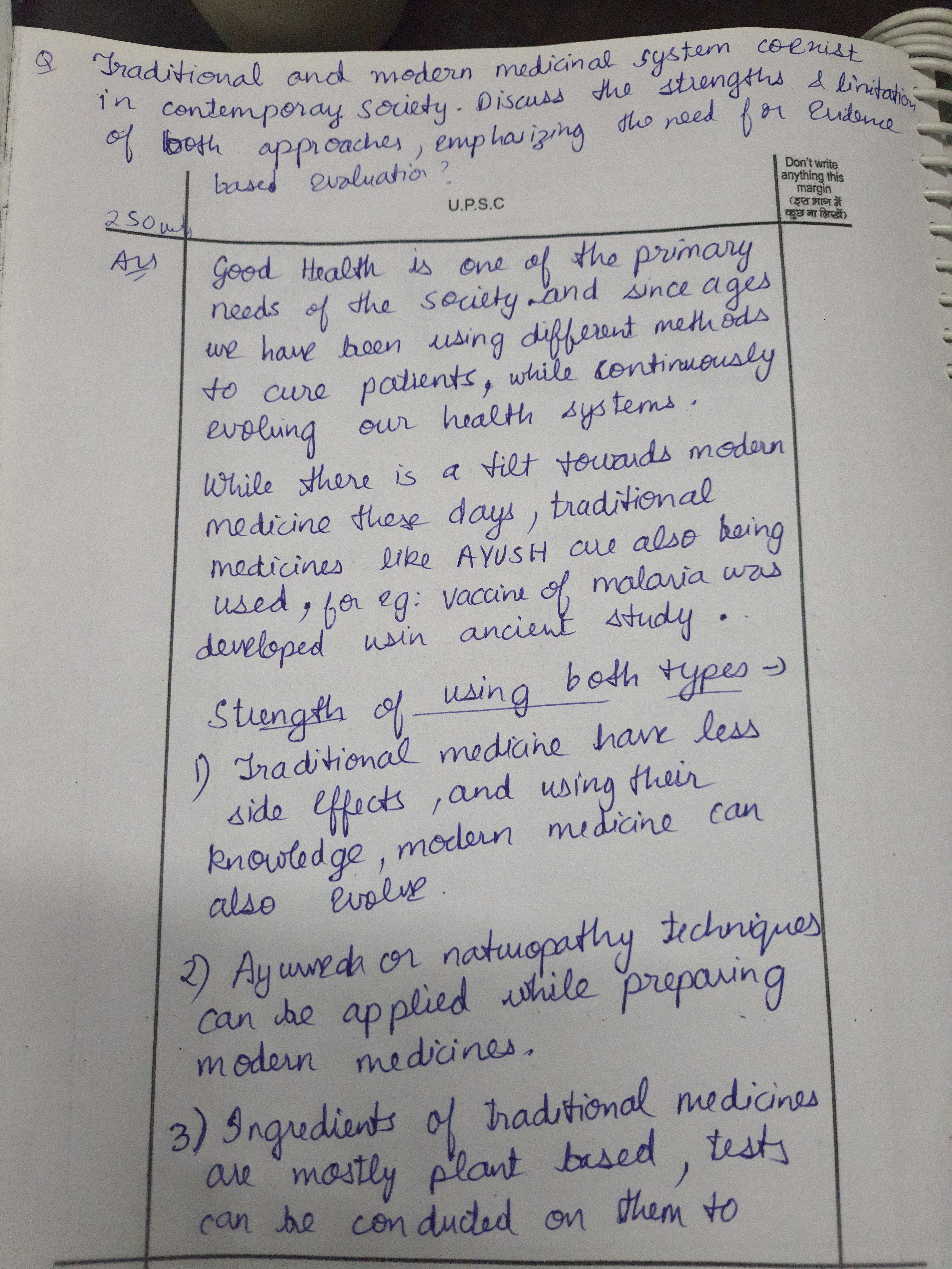 Q. Traditional and modern medicinal systems coexist in contemporary society. Discuss the strengths and limitations of both approaches, emphasizing the need for evidence-based evaluation. (250 words, 15 Marks)