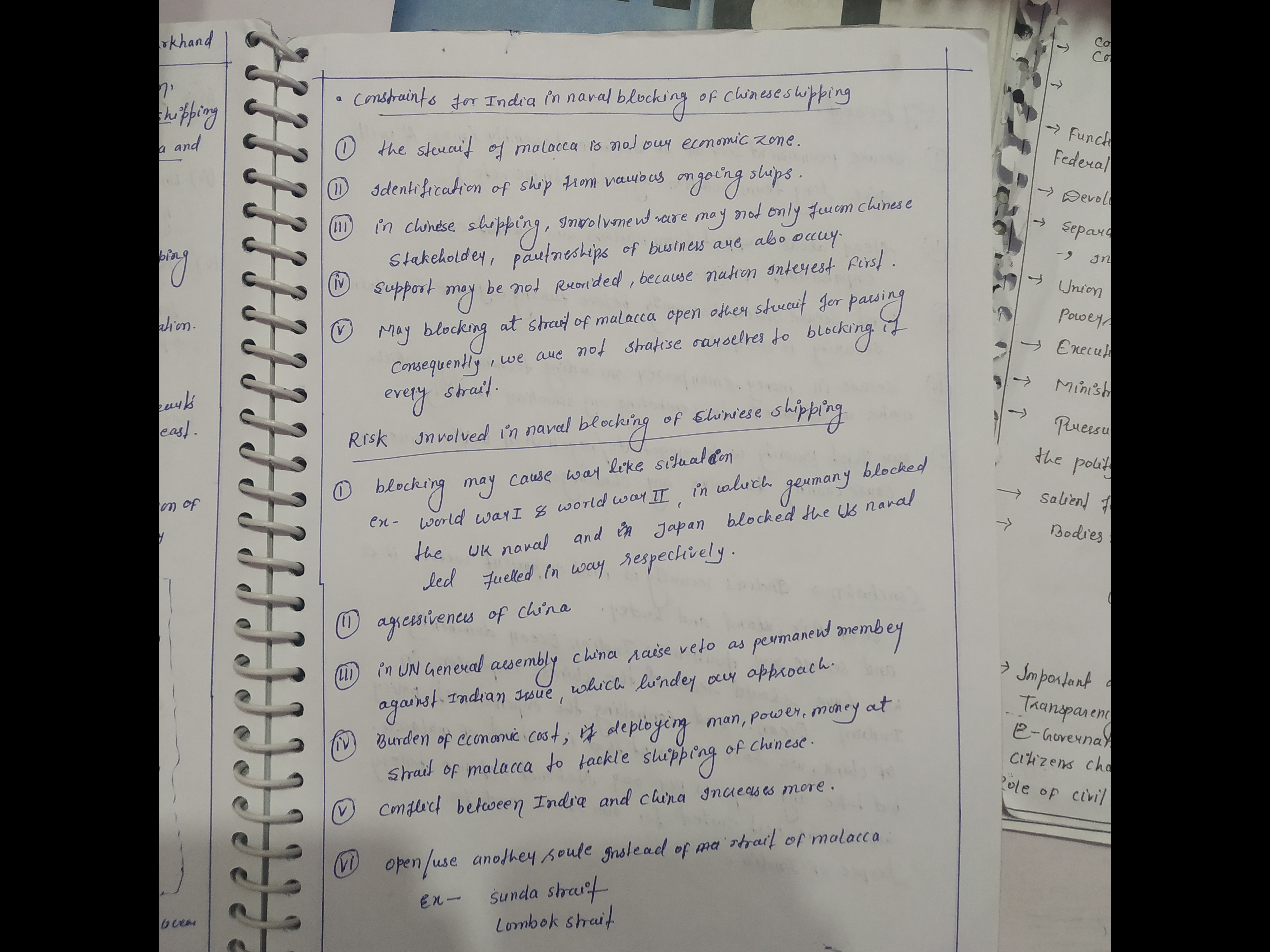 The constraints and risks involved in considering a naval blockade or interdiction of Chinese shipping by India in the Malacca Strait are manifold, ranging from legal challenges and regional economic fallout to the practical ineffectiveness given China’s strategic alternatives. Any such action would require India to weigh the long-term strategic costs against the short-term tactical gains, keeping in mind the broader implications on international law, regional stability, and global diplomatic relations. India’s role may thus be more prudent in adopting a stance of proactive defense of its territorial interests and ensuring the security of its supply chains rather than engaging in aggressive maneuvers that could have disproportionate repercussions.