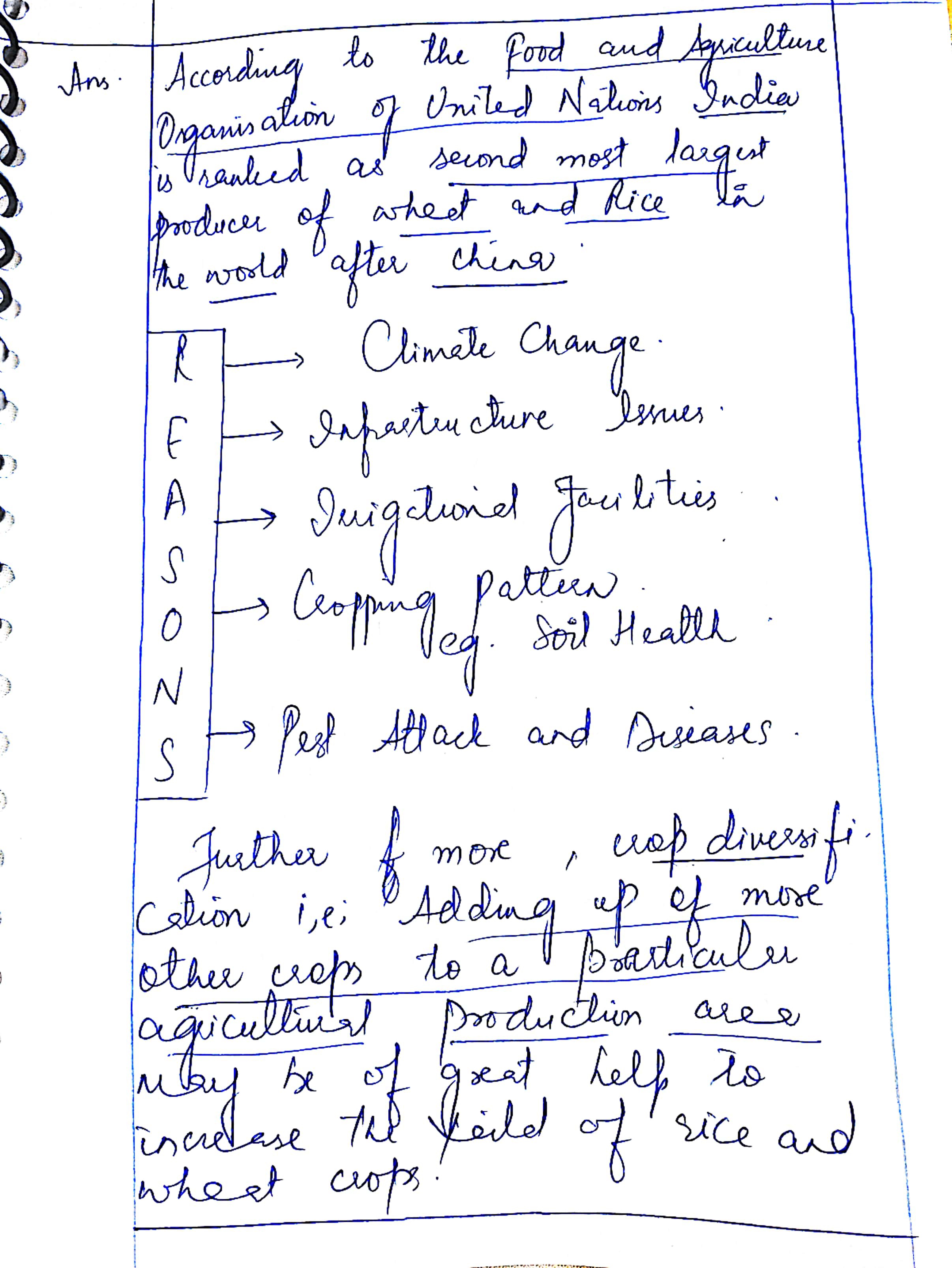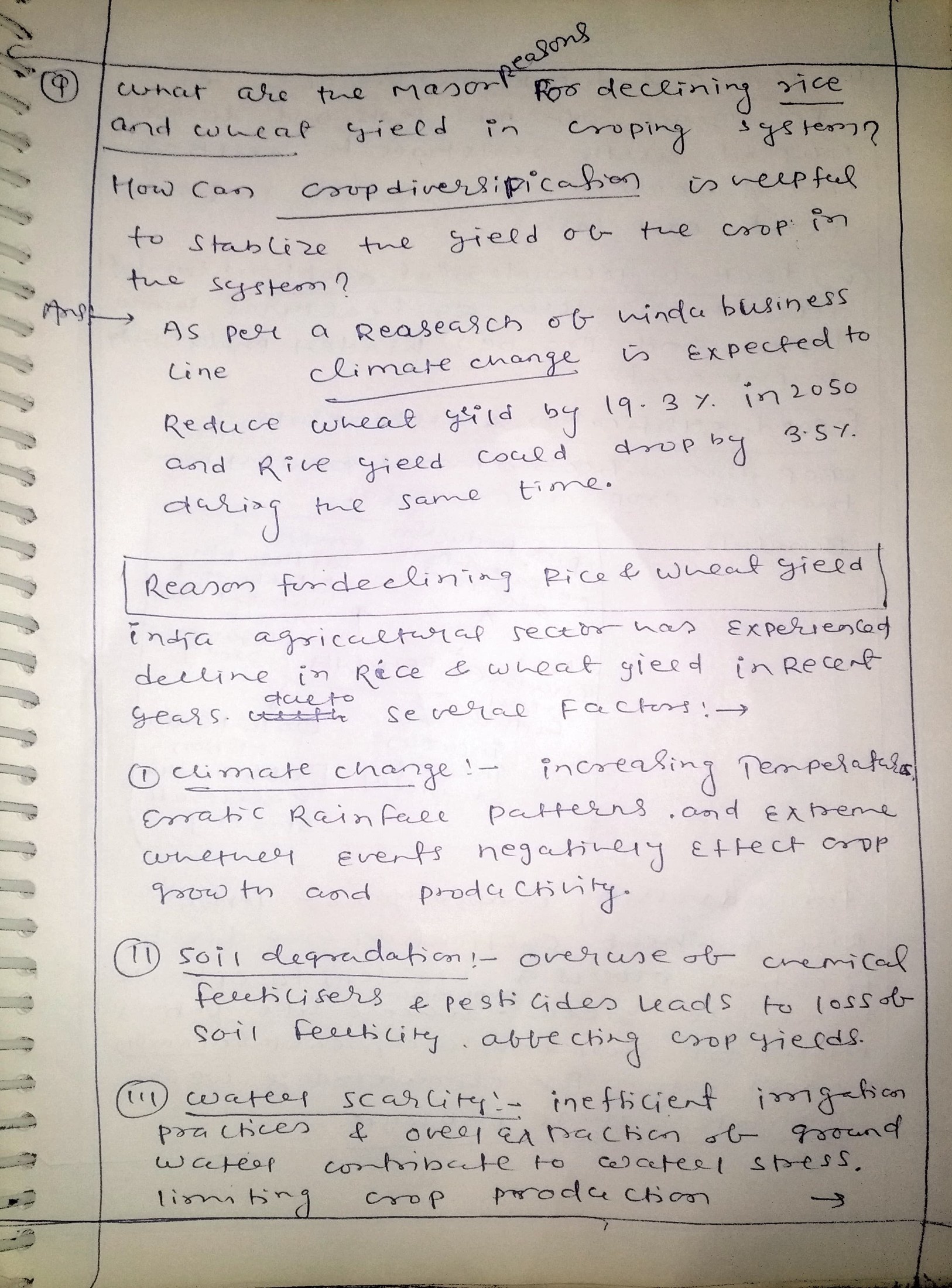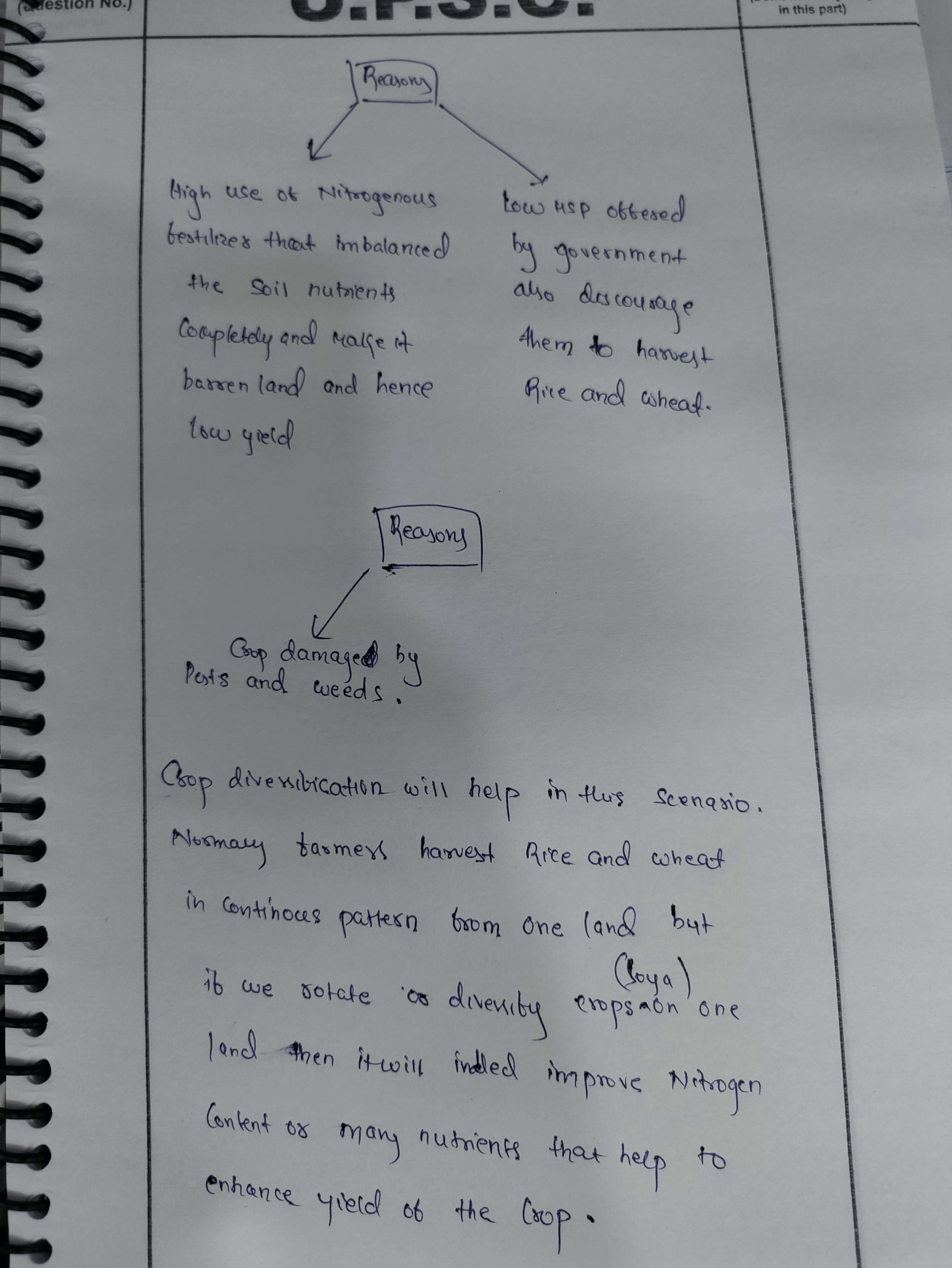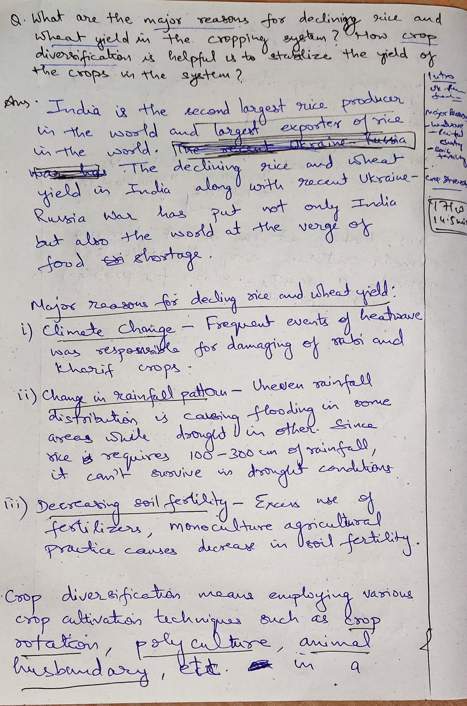 Q. What are the major reasons for declining rice and wheat yield in the cropping system? How crop diversification is helpful is to stabilize the yield of the crops in the system? (150 Words. 10 Marks)