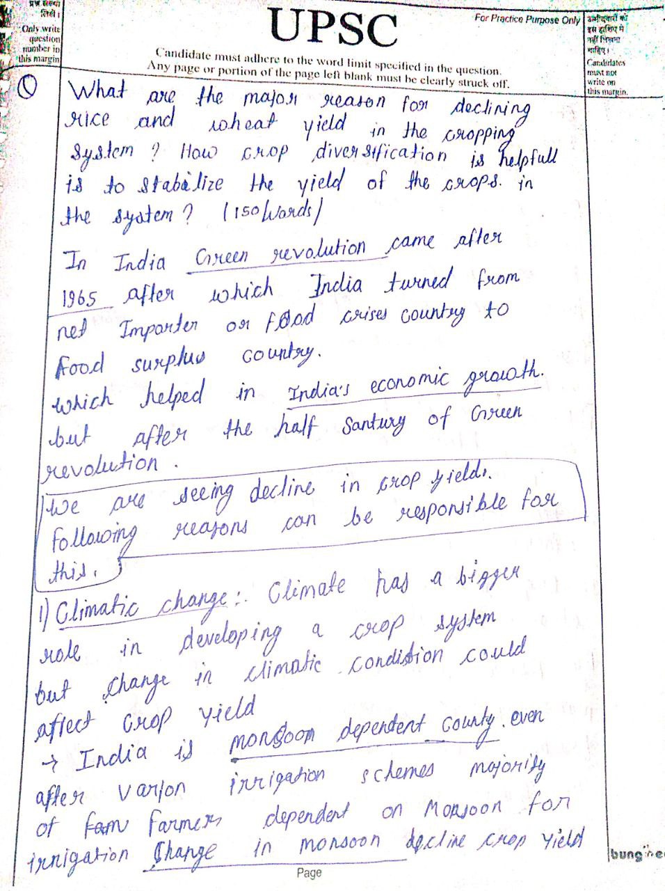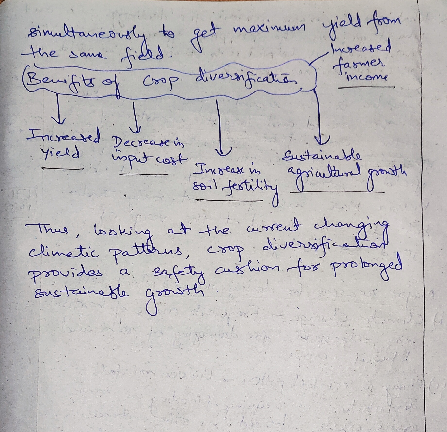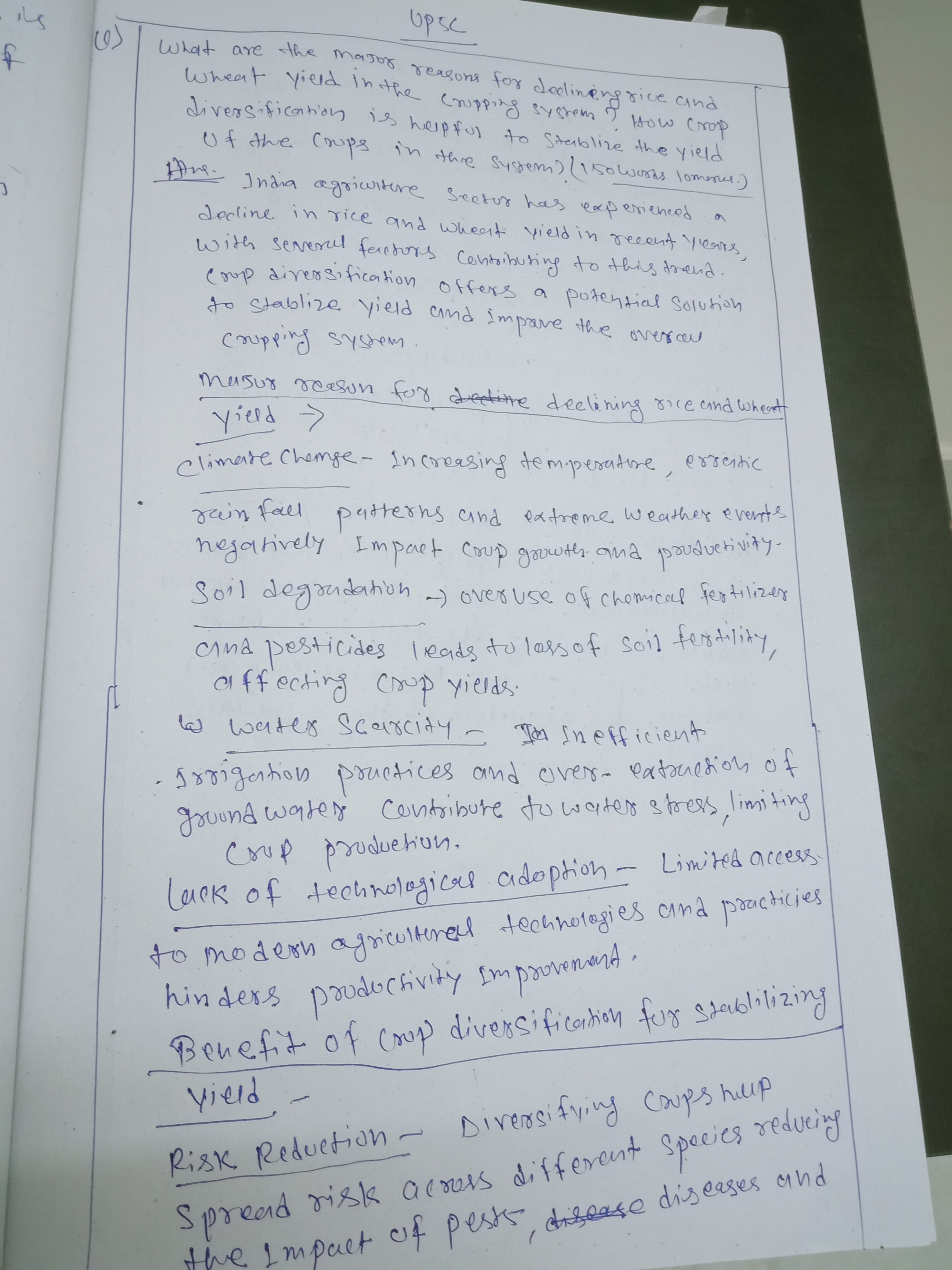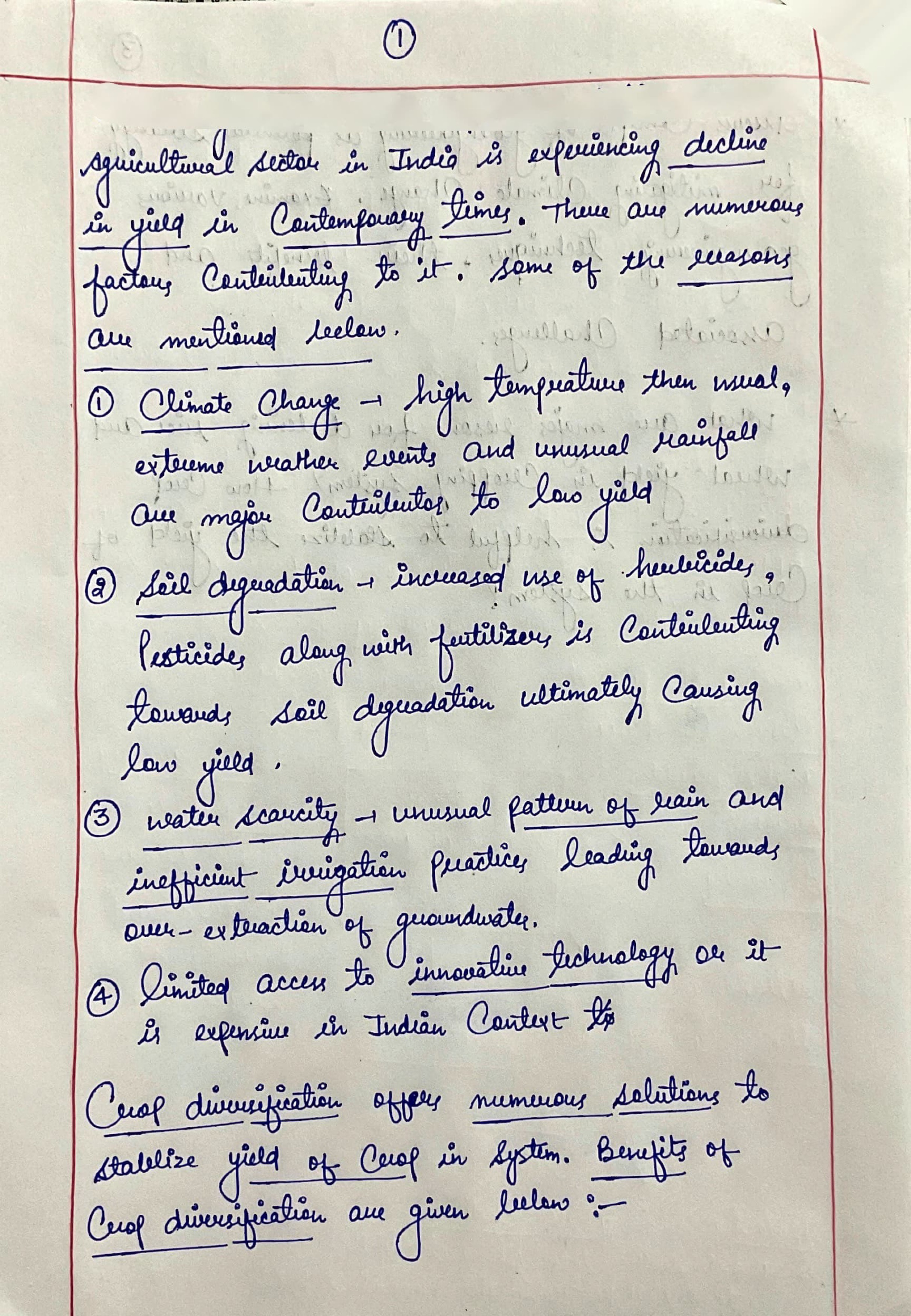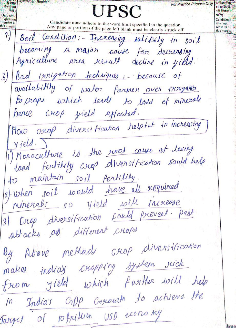 Q. What are the major reasons for declining rice and wheat yield in the cropping system? How crop diversification is helpful is to stabilize the yield of the crops in the system? (150 Words. 10 Marks)