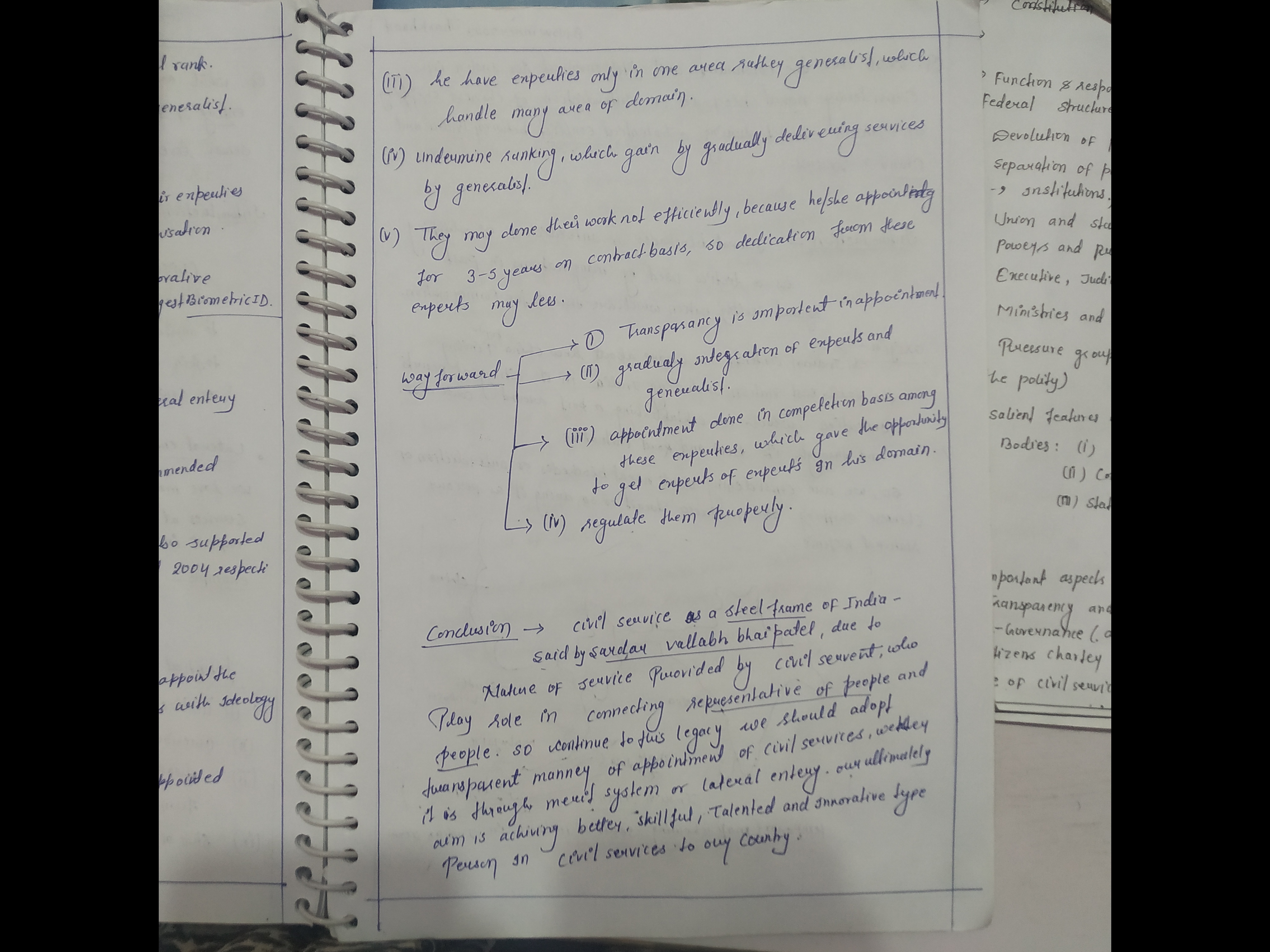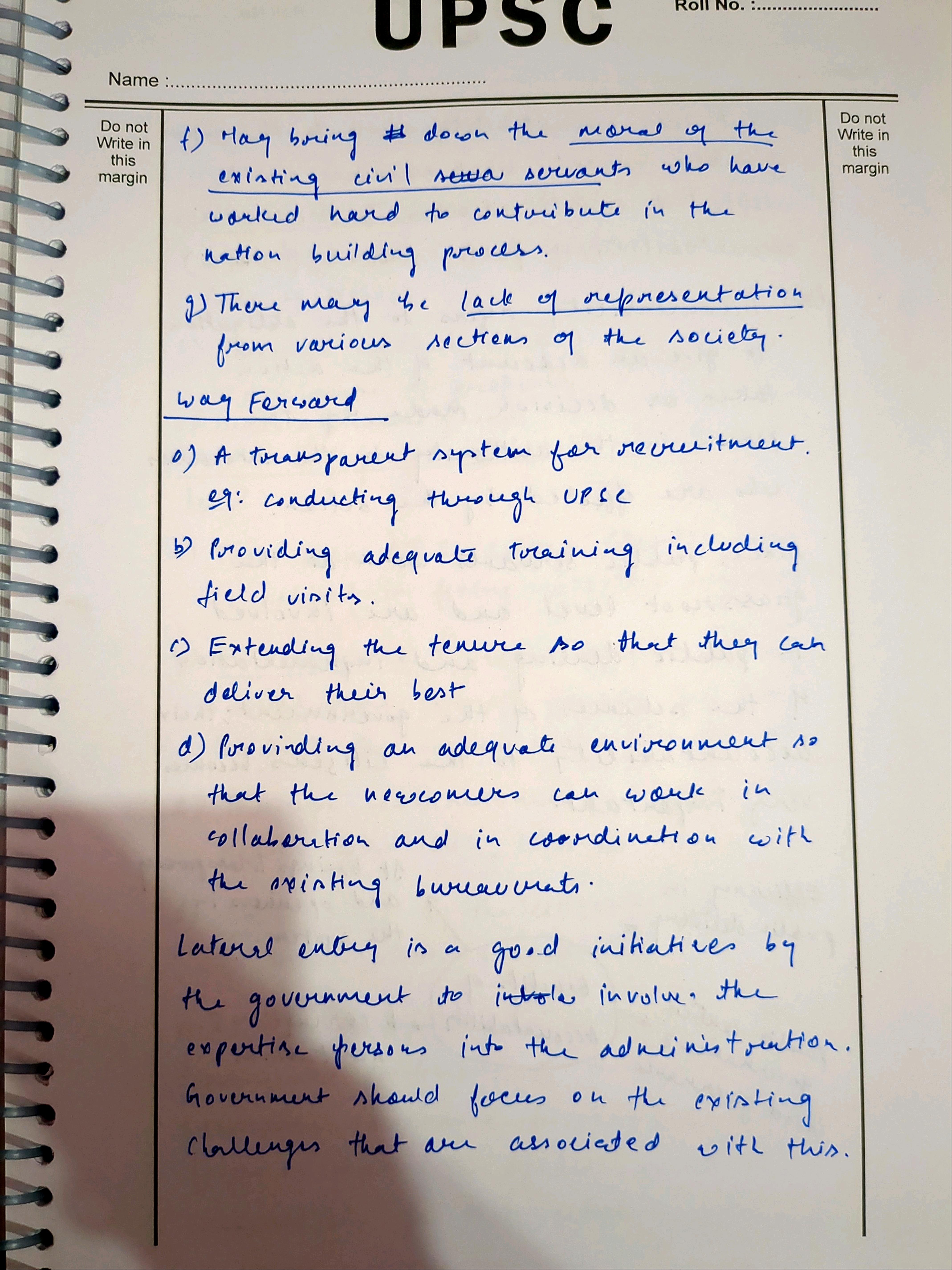 The concept of lateral entry in civil services has the potential to revitalize the bureaucracy with specialized knowledge and skills. However, it is essential to ensure that such entries are made transparently and based on merit, with a clear definition of roles, expectations, and accountability mechanisms. Moreover, efforts should be made to prepare the existing civil service system for this integration to mitigate any potential negative impact on its morale and functioning. Balancing the infusion of external talent with the strengthening of internal capacity can lead to a more dynamic and effective civil service, capable of meeting the complex challenges of modern governance.