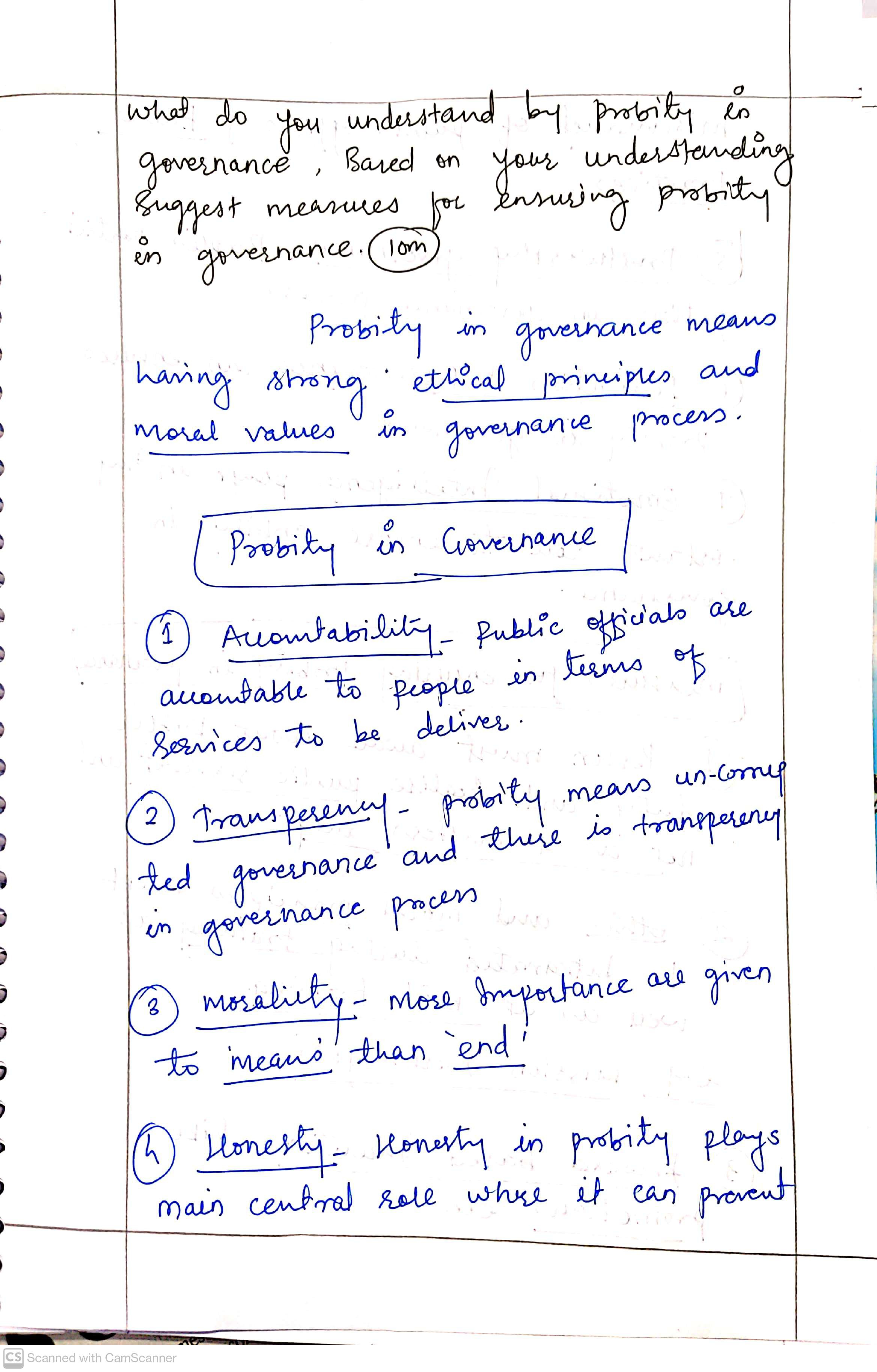 Probity in governance refers to the adherence to high ethical and moral standards in the conduct of public affairs. It encompasses principles such as transparency, accountability, integrity, honesty, and fairness. Ensuring probity in government is crucial to building public trust, promoting good governance, and combating corruption.
