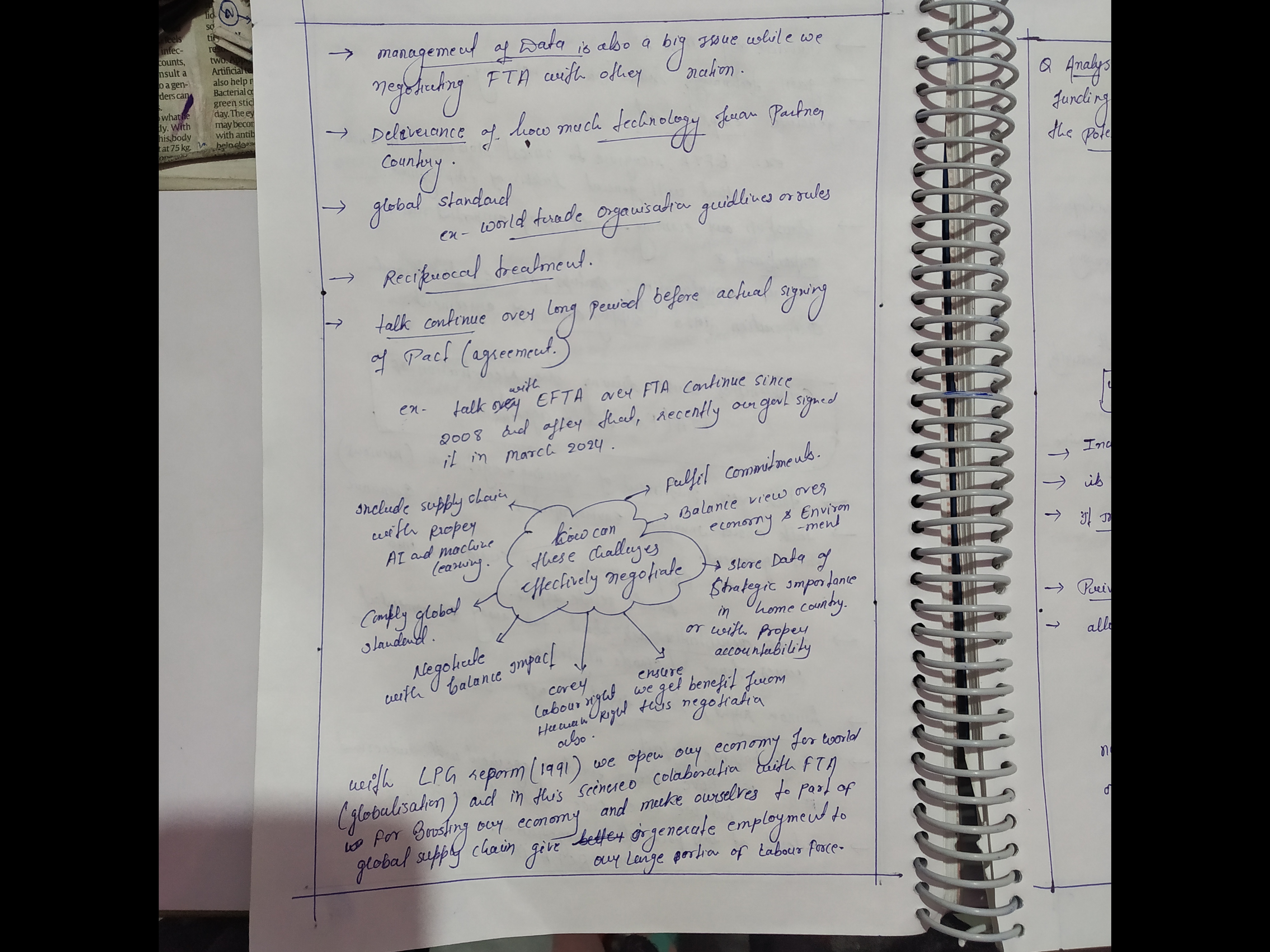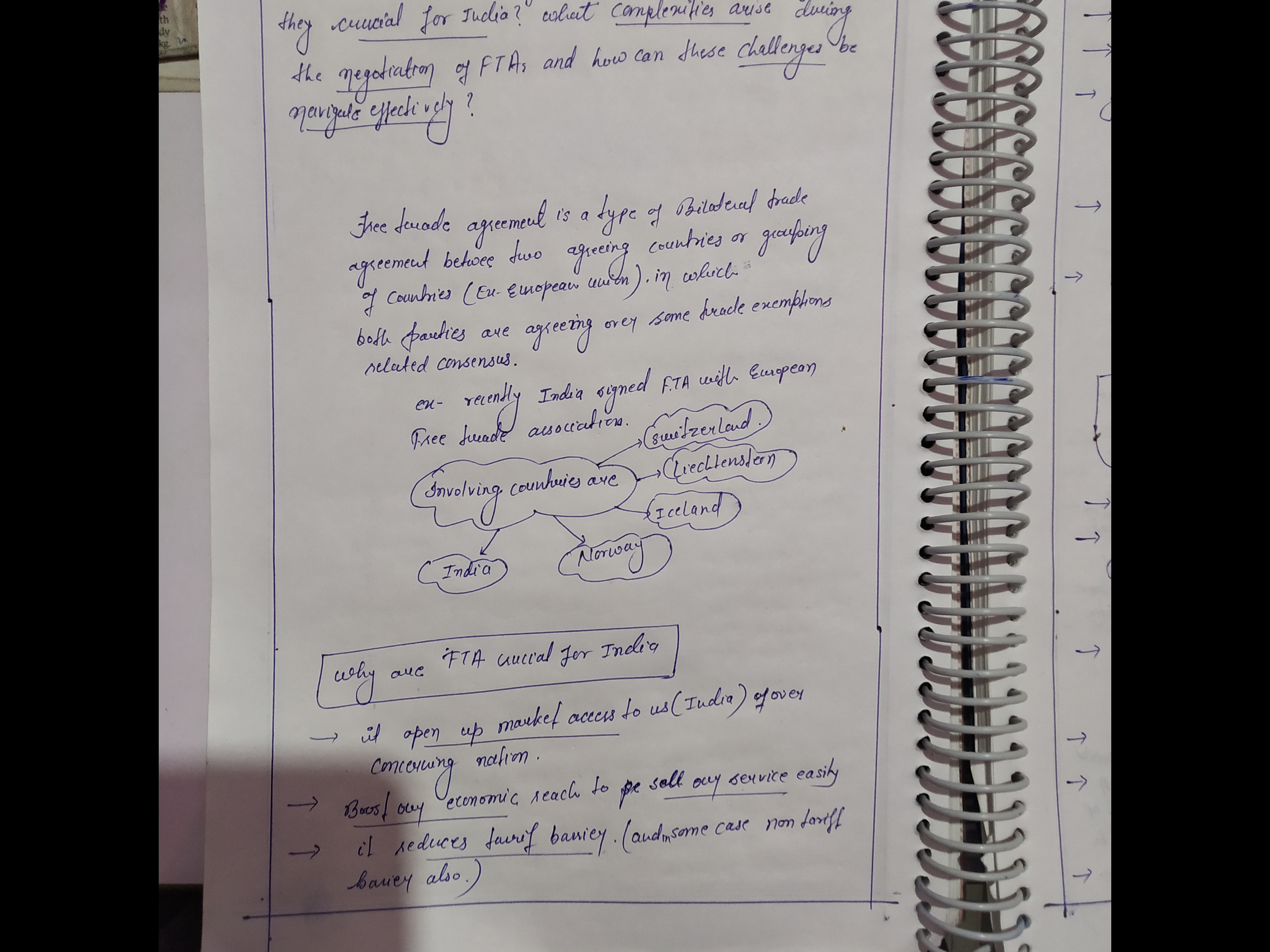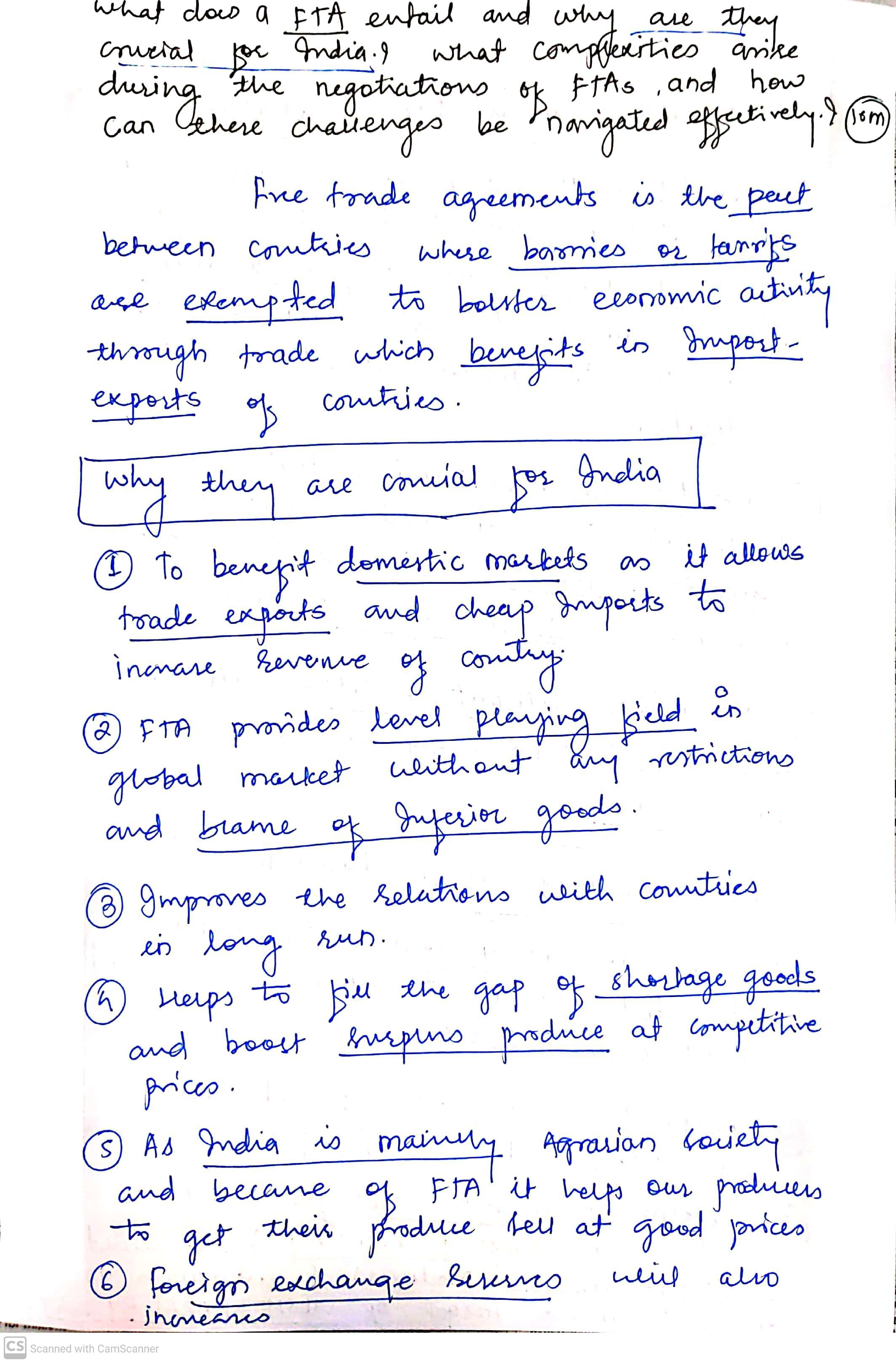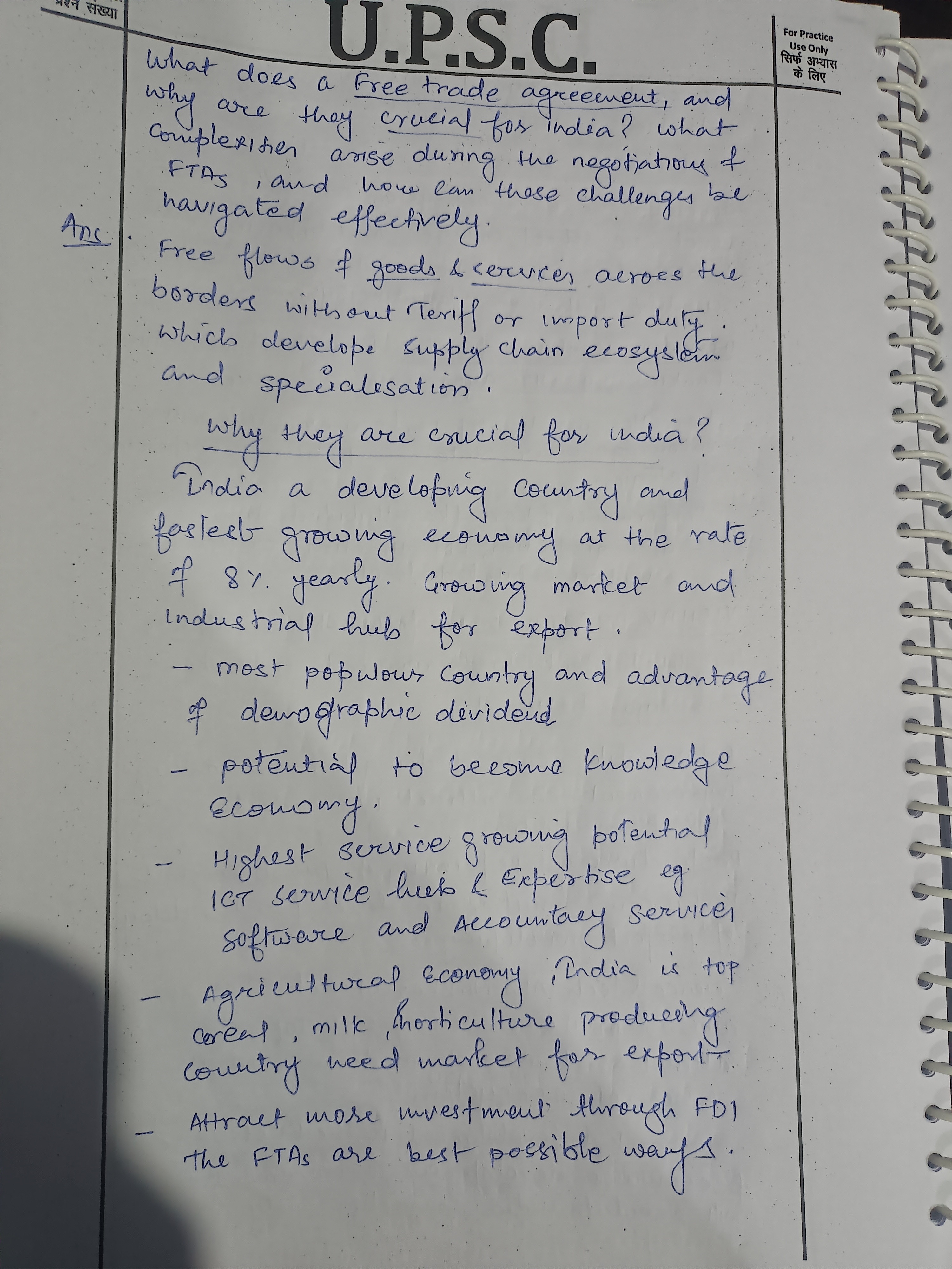Q. What does a free trade agreement (FTA) entail, and why are they crucial for India? What complexities arise during the negotiation of FTAs, and how can these challenges be navigated effectively? (10 marks, 150 words)