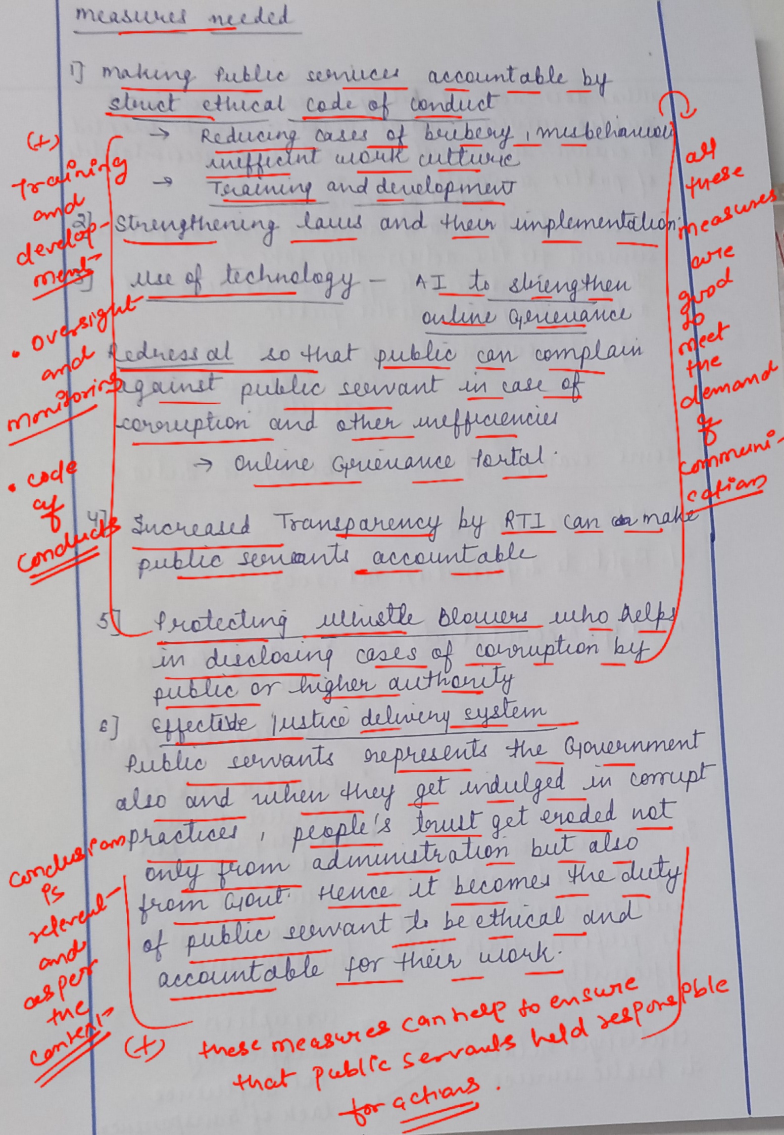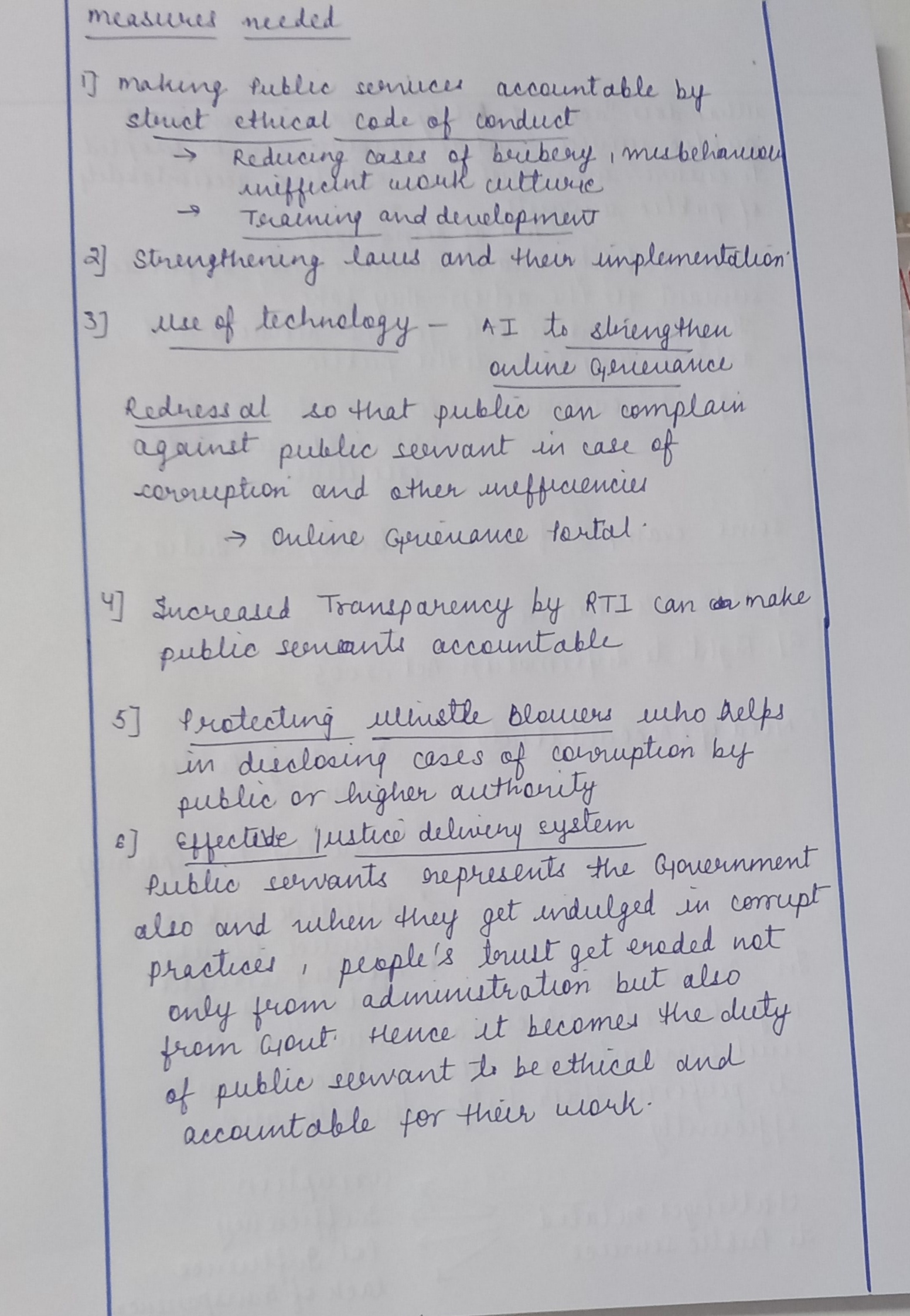 The implementation of these measures can help to ensure that public servants are held responsible for their actions and decisions, leading to a more efficient and effective government that serves the public interest. Ultimately, a culture of accountability in public service can contribute to building a more just and democratic society.