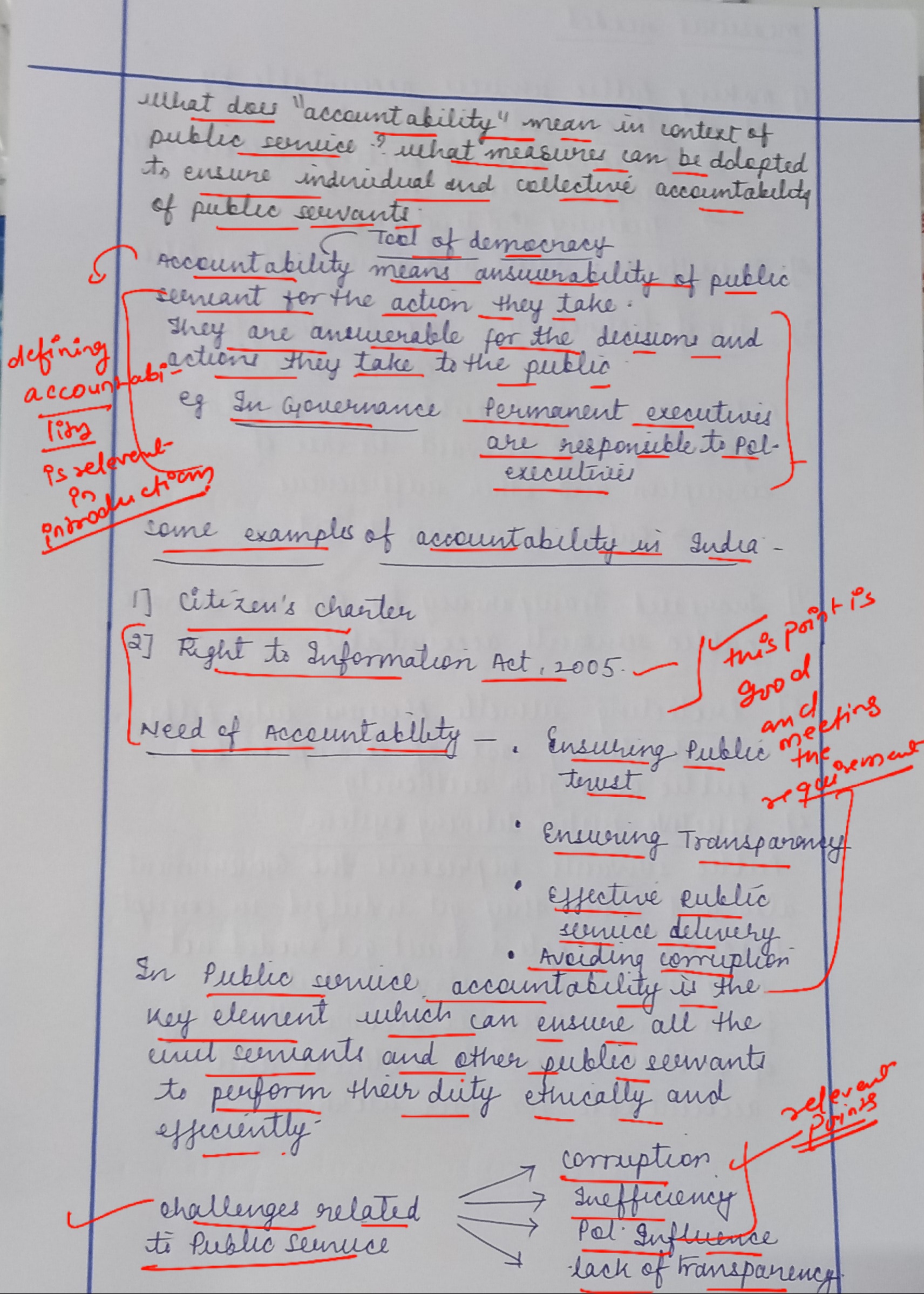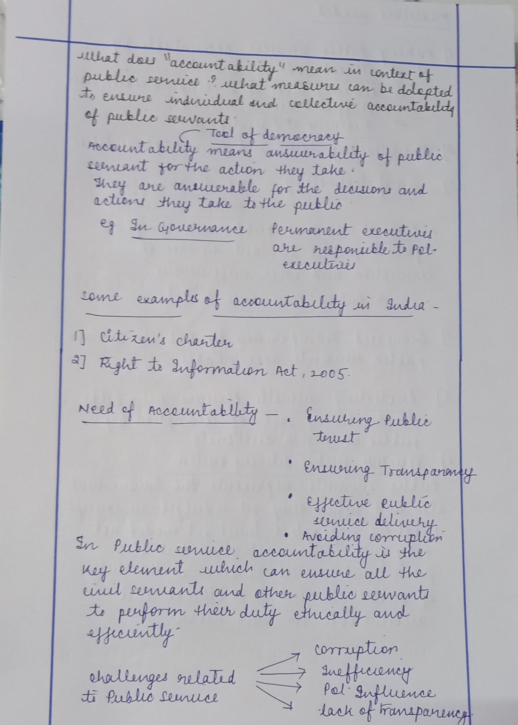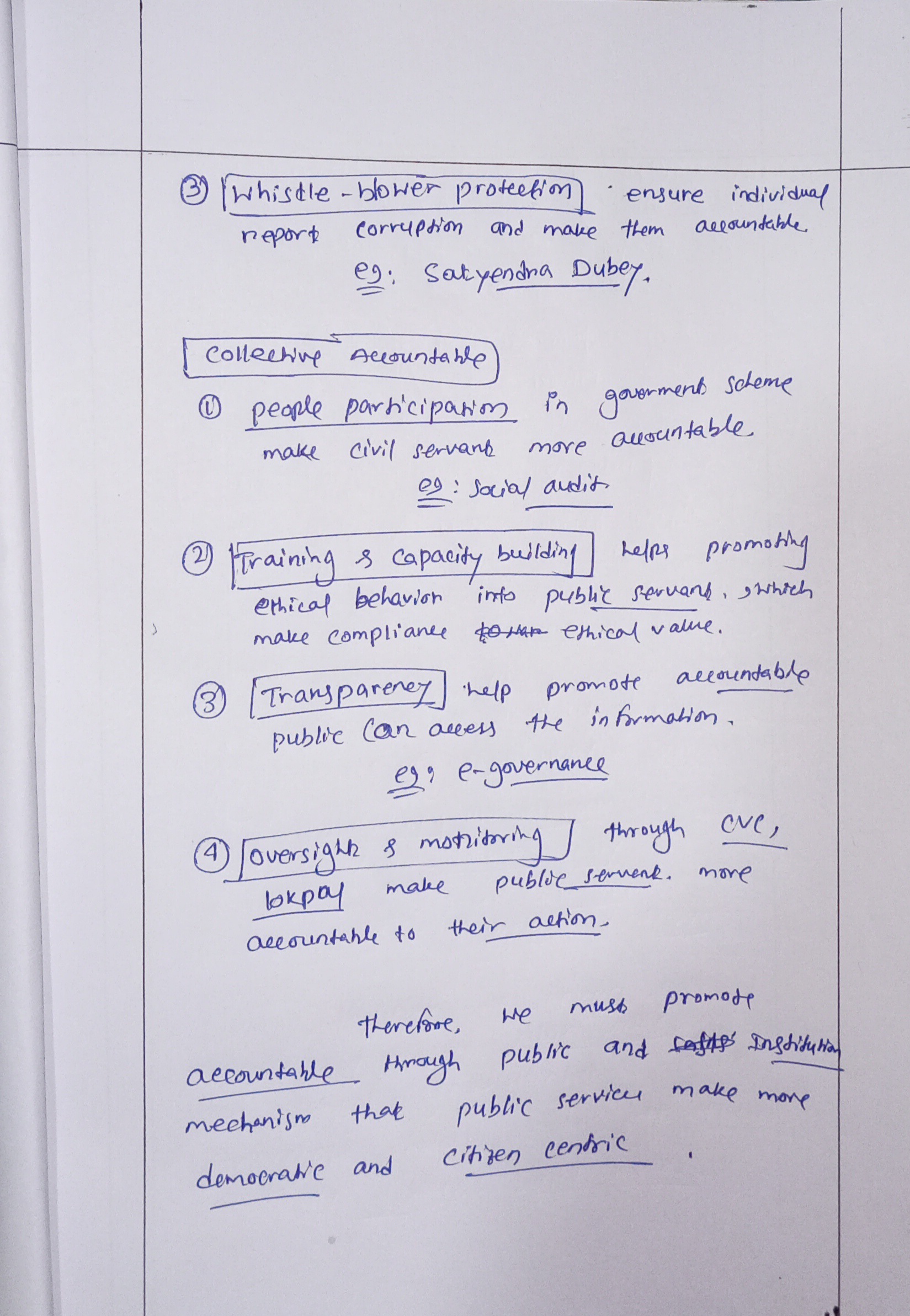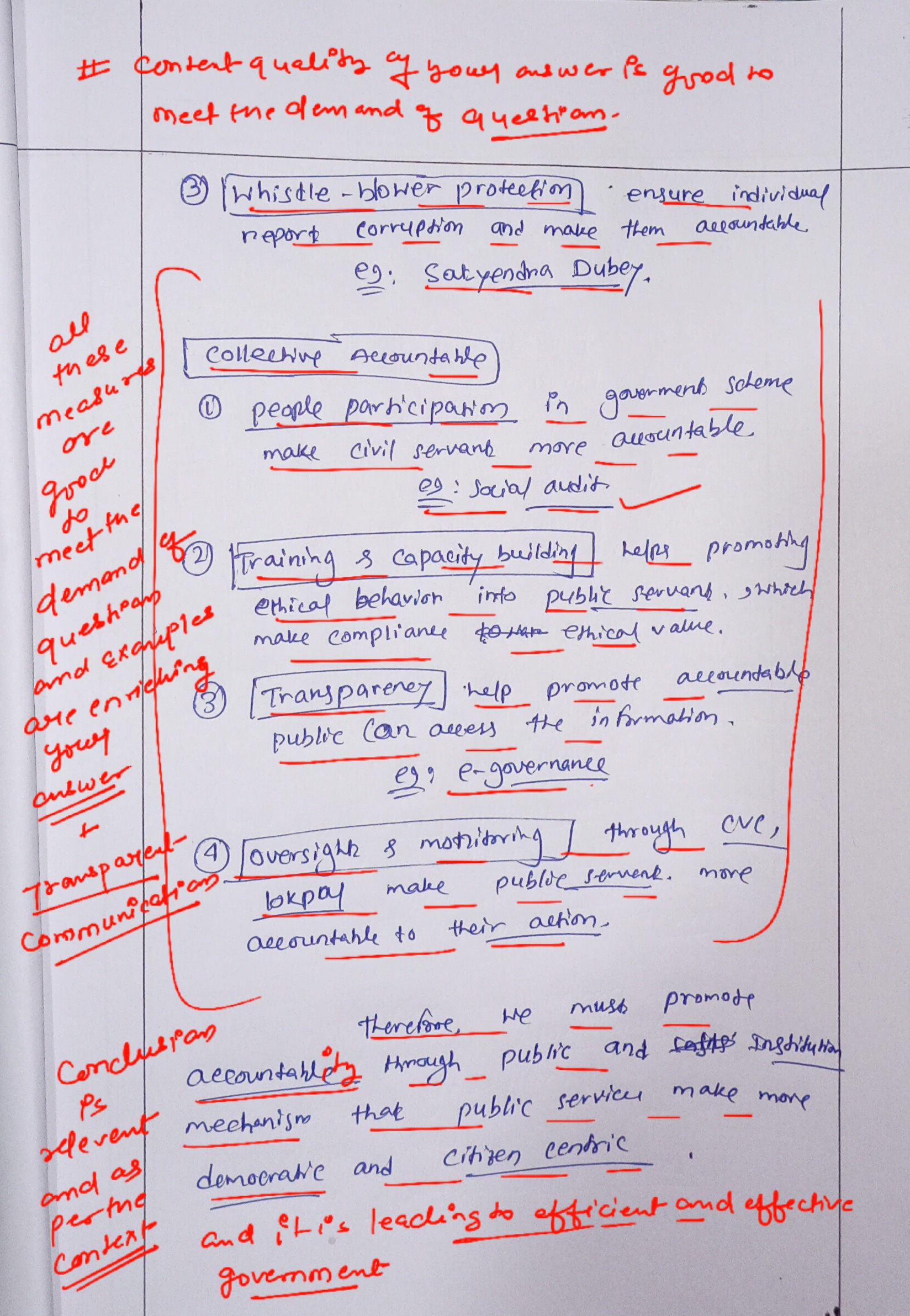 - Explain the steps to be taken to ensure individual and collective accountability of public servants along with proper substantiation.