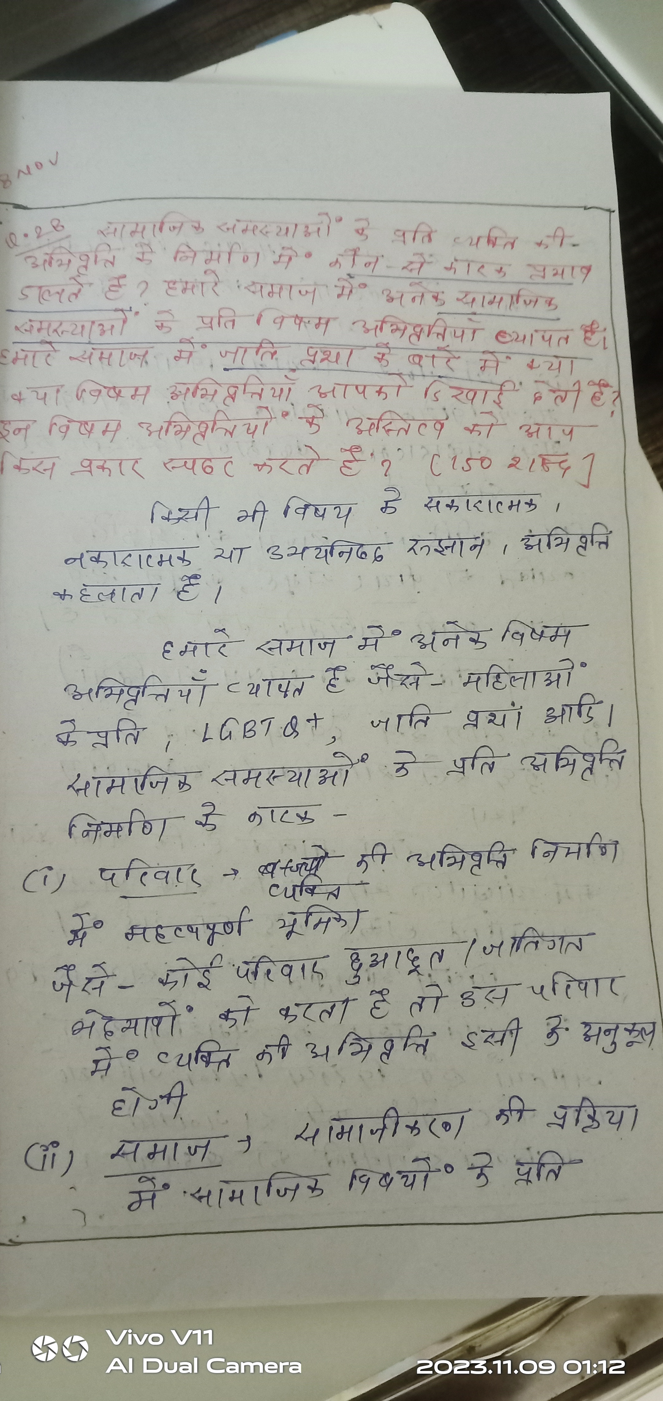 निष्कर्षतः, सामाजिक समस्याओं के प्रति अभिवृत्ति का निर्माण जटिल है और विभिन्न कारकों से प्रभावित होता है। भारतीय समाज में जाति व्यवस्था के प्रति विरोधाभासी अभिवृत्ति को सांस्कृतिक और सामाजिक मानदंडों, व्यक्तिगत अनुभवों और शिक्षा के प्रभाव के लिए जिम्मेदार ठहराया जा सकता है। सामाजिक समस्याओं के समाधान और अधिक समतापूर्ण एवं निष्पक्ष समाज को बढ़ावा देने के लिए शिक्षा और जागरूकता को बढ़ावा देना आवश्यक है।