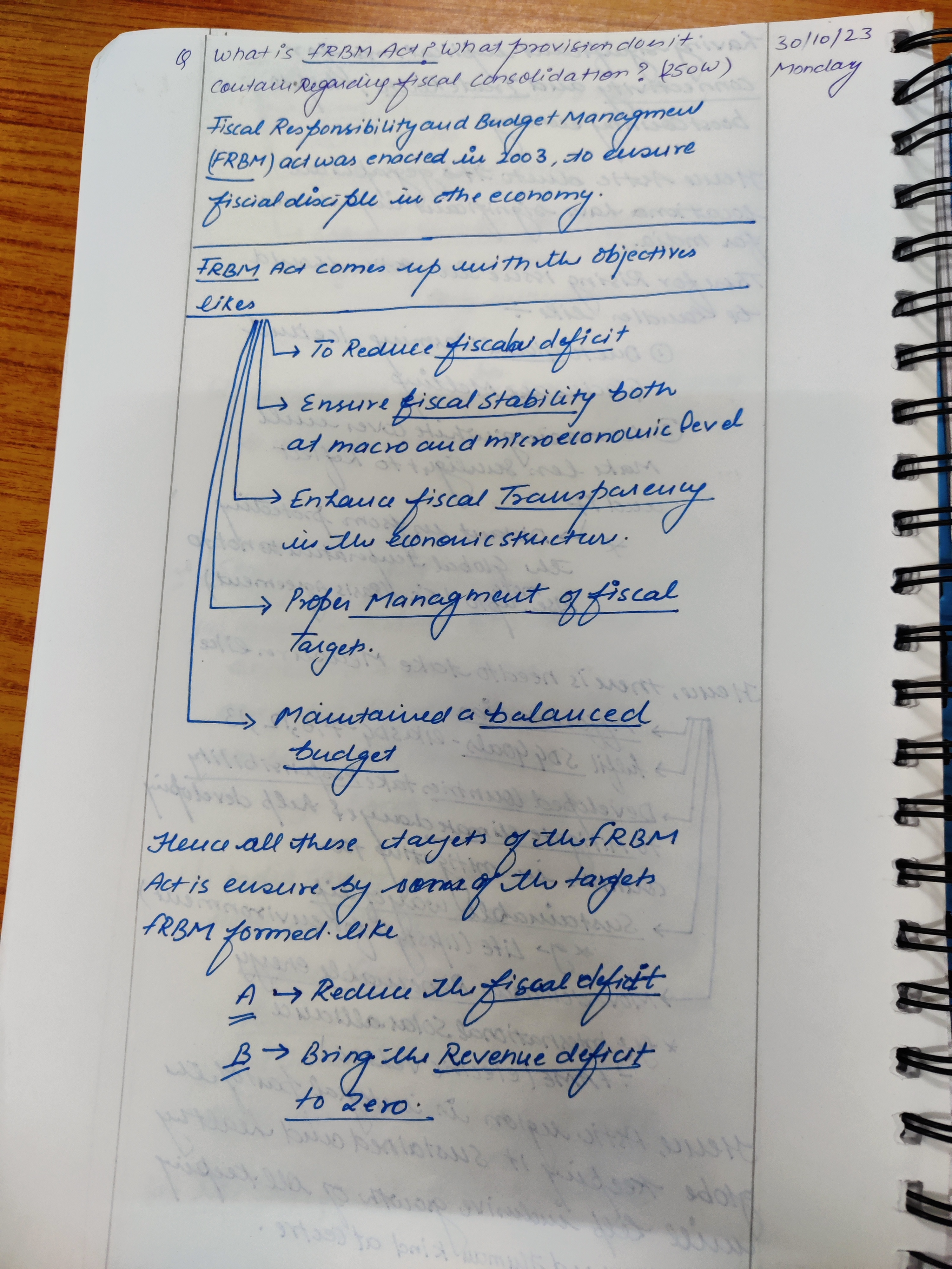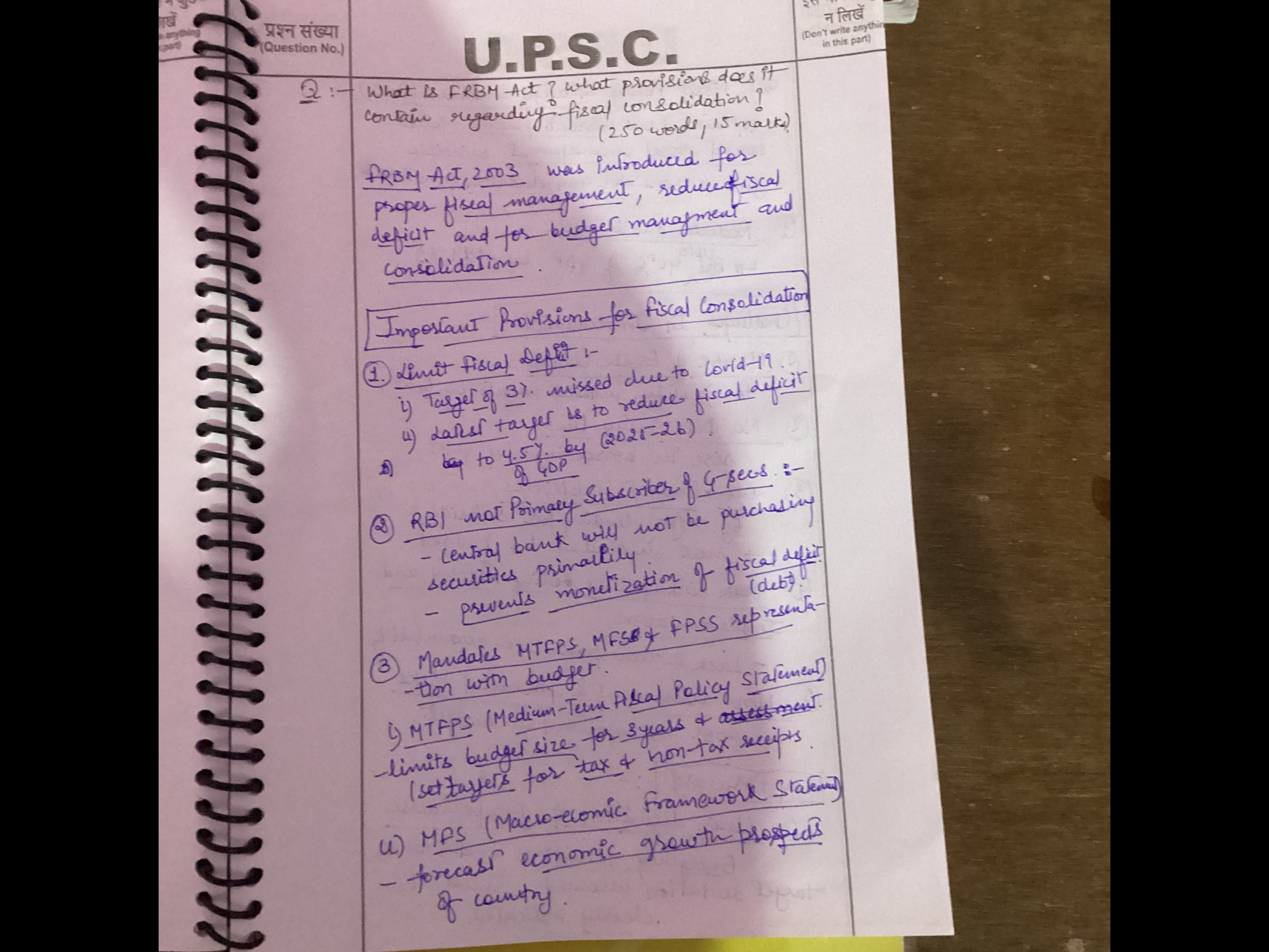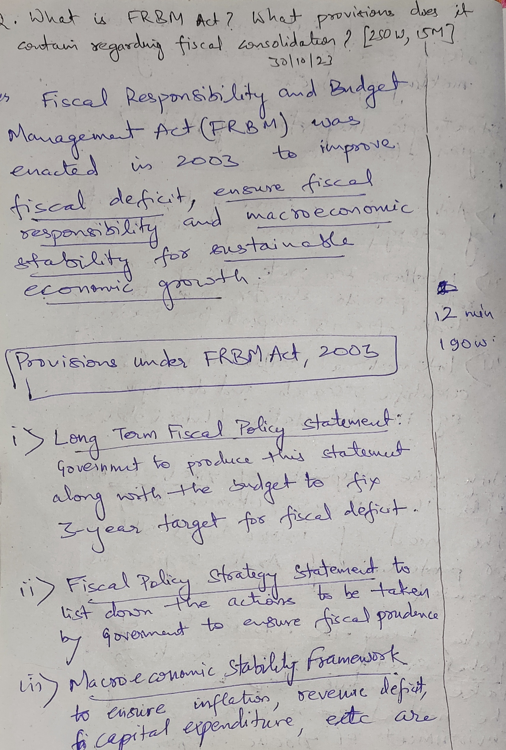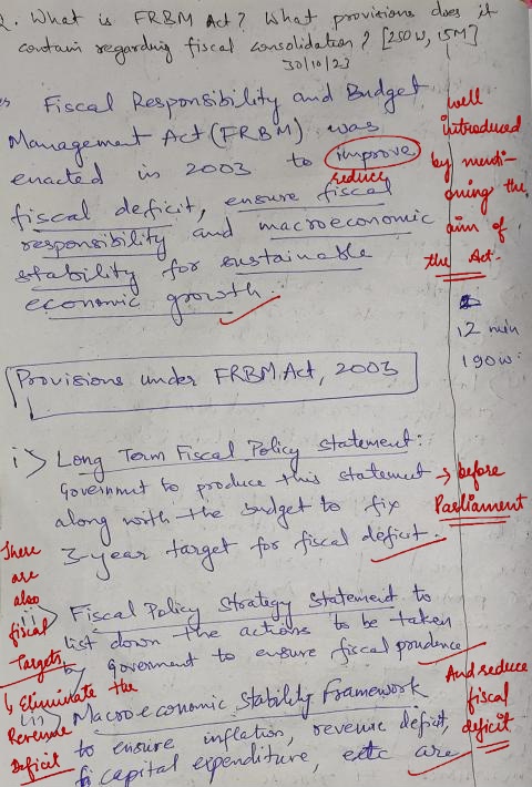 Q. What is FRBM Act? What provisions does it contain regarding fiscal consolidation? (250 words, 15 Marks)