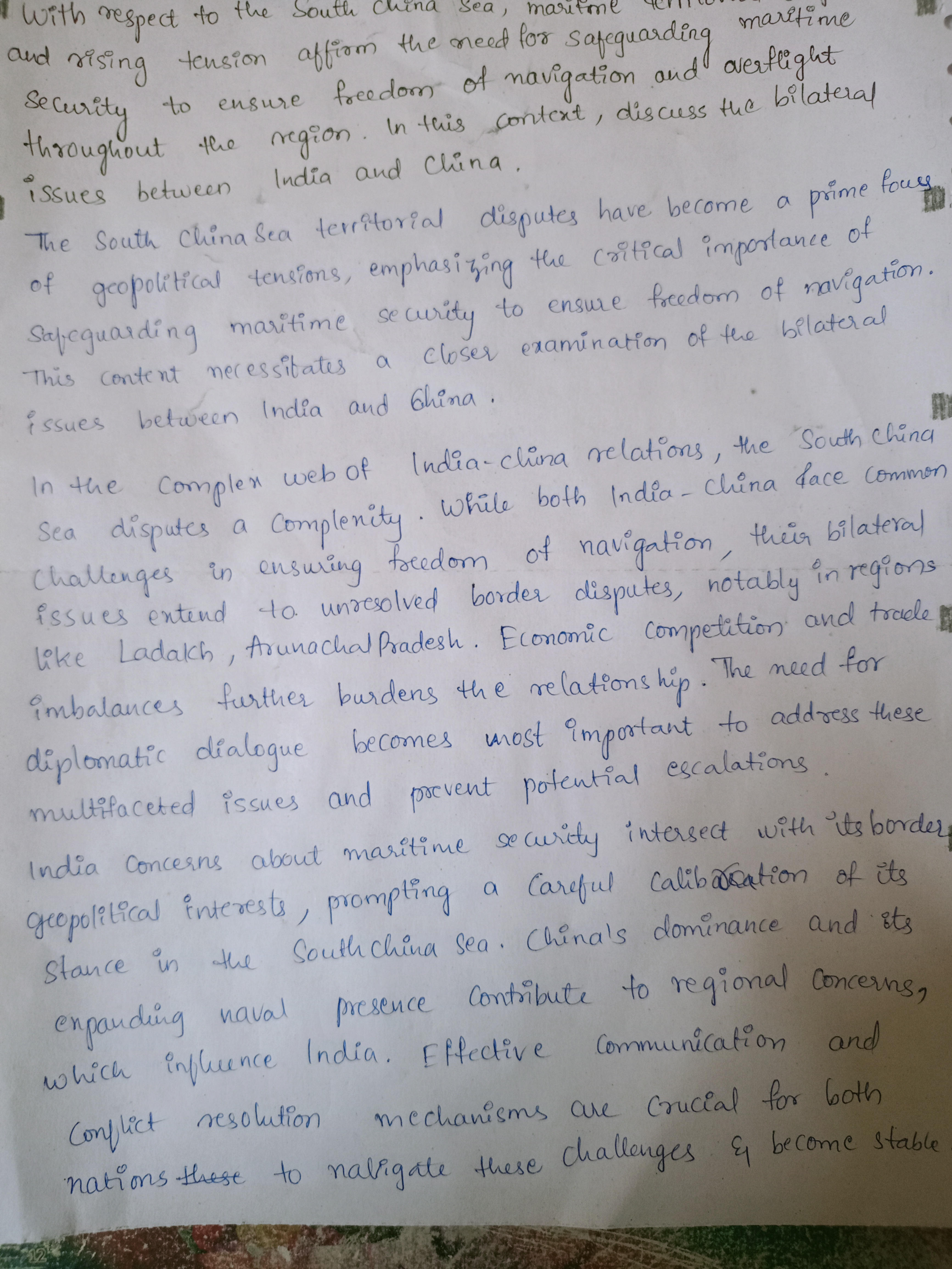 The South China Sea disputes and the India-China bilateral issues are intertwined with broader geopolitical dynamics. India’s increasing involvement in the South China Sea is driven by strategic interests, concerns over freedom of navigation, and the need to balance China’s growing regional influence. Simultaneously, the complex and often tense bilateral relationship between India and China, marked by border disputes, differing worldviews, and strategic competition, adds layers of complexity to the regional security landscape. Therefore, it is imperative for regional stakeholders to pursue diplomatic engagement and adhere to international law to ensure stability and prevent escalation of conflicts in this critical maritime domain.