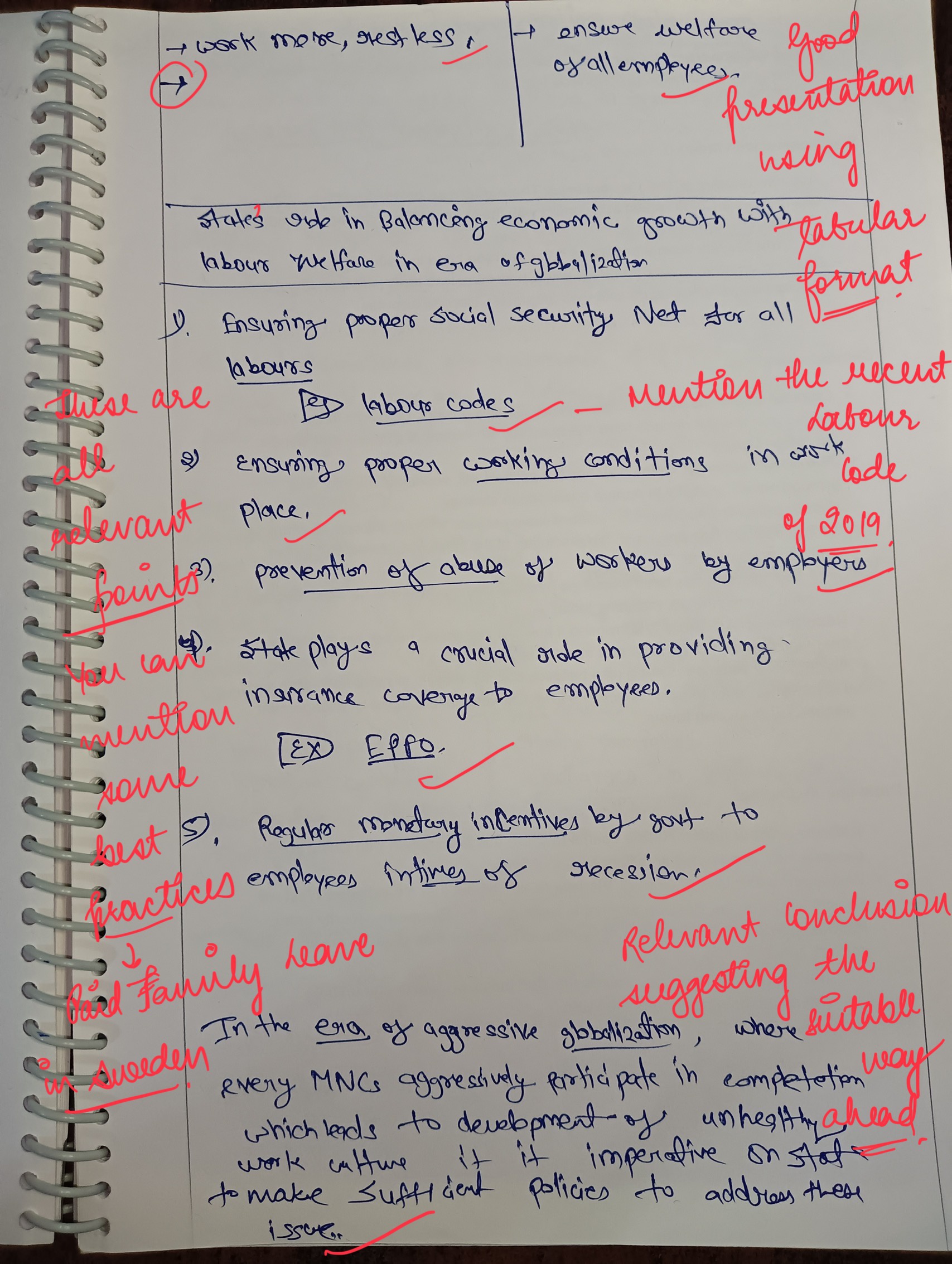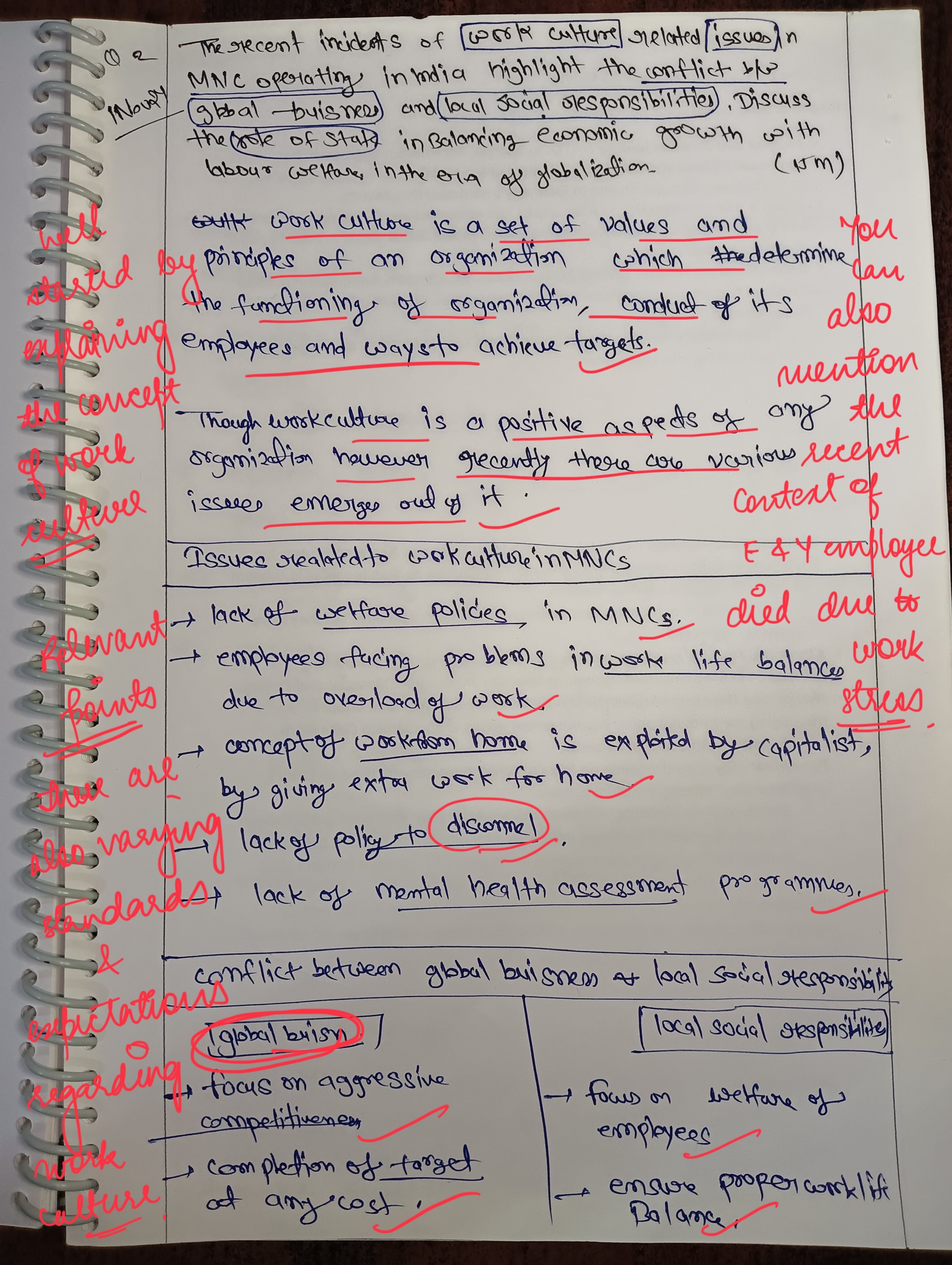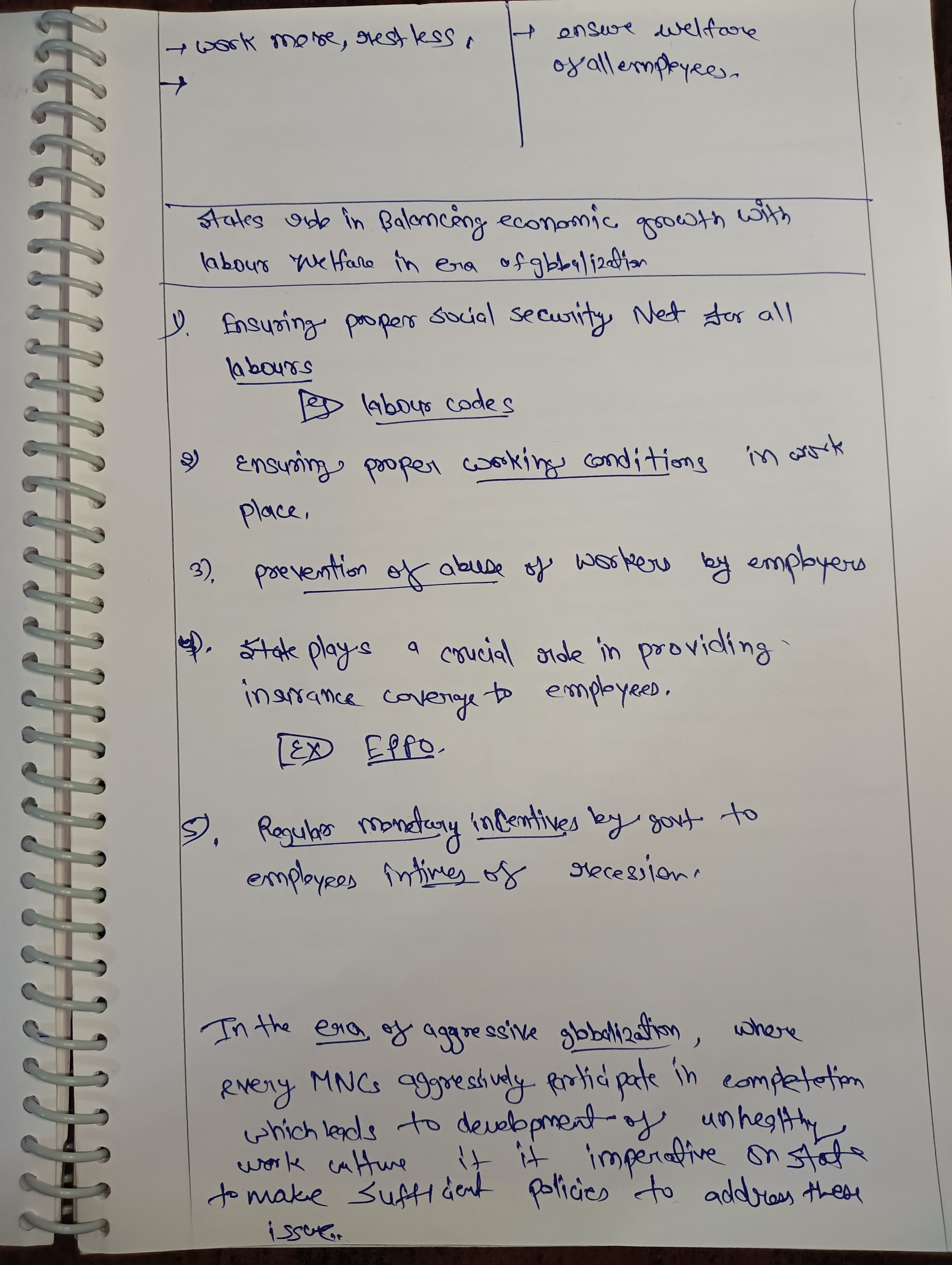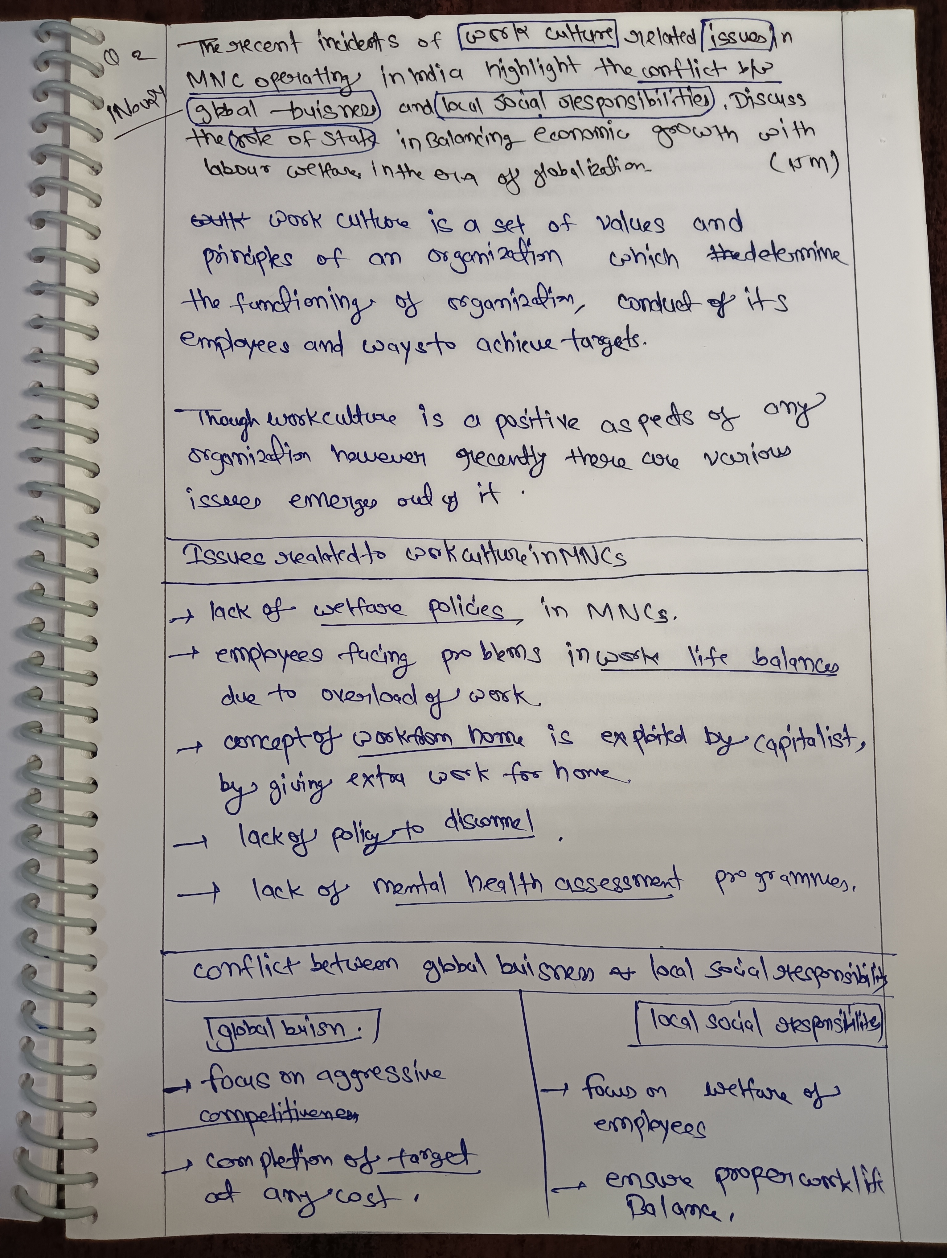 Q. The recent incidents of work-culture-related issues in multinational corporations operating in India highlight the conflict between global business practices and local social realities. Discuss the role of state in balancing economic growth with labour welfare in the era of globalization. (15 Marks, 250 Words)