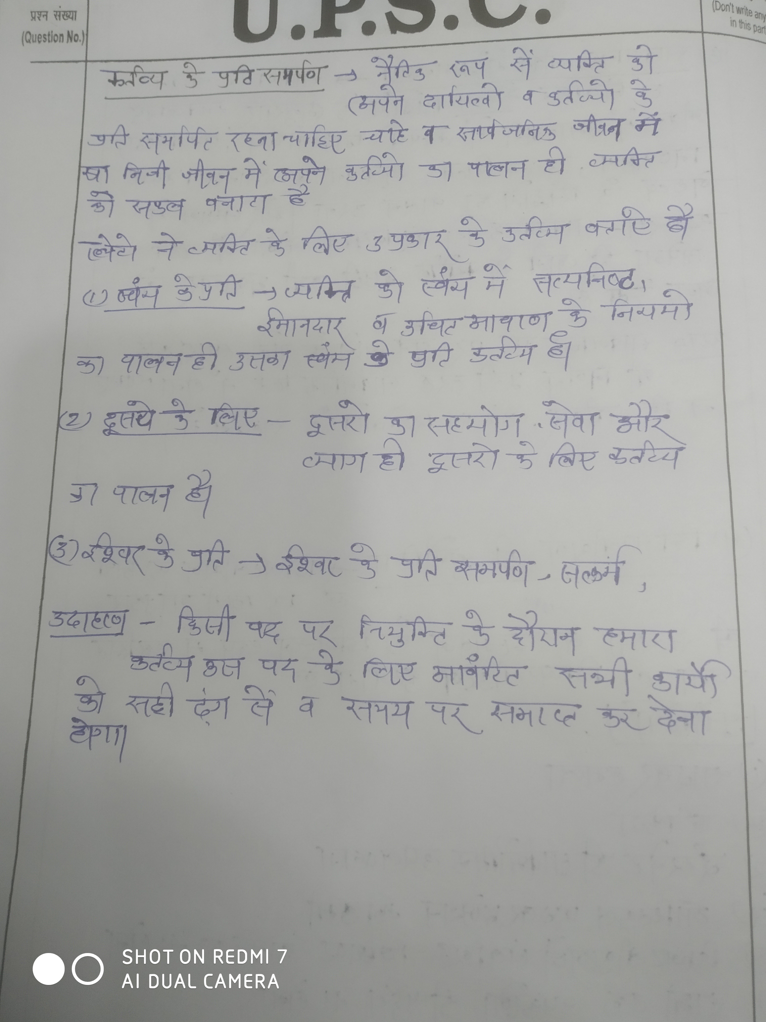 - कर्तव्य के प्रति समर्पण: कर्तव्य के प्रति समर्पण व्यक्तियों की अपने कार्यों और जिम्मेदारियों को बिना किसी पूर्वाग्रह या पक्षपात के अपनी सर्वोत्तम क्षमता से करने की प्रतिबद्धता और जिम्मेदारी को संदर्भित करता है।